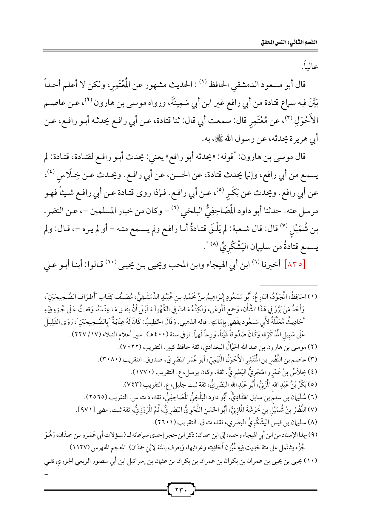 قال موسى بن هارون: "قوله: «يحدثه أبو رافع» يعني: يحدث أبو رافع لقتادة، قتادة: لم يسمع من أبي رافع، وإنما يحدث قتادة، عن الحسن، عن أبي رافع. ويحدث عن خِلَاسٍ (¬4)، عن أبي رافع. ويحدث عن بَكْرٍ (¬5)، عن أبي رافع. فإذا روى قتادة عن أبي رافع شيئاً فهو مرسل عنه. حدثنا أبو داود الْمَصَاحِفِيُّ البلخي (¬6) - وكان من خيار المسلمين -، عن النضر بن شُمَيْلٍ (¬7) قال: قال شعبة: لم يَلْقَ قتادةُ أبا رافع ولم يسمع منه - أو لم يره -، قال: ولم يسمع قتادةُ من سليمان اليَشْكُرِيِّ (¬8) ".