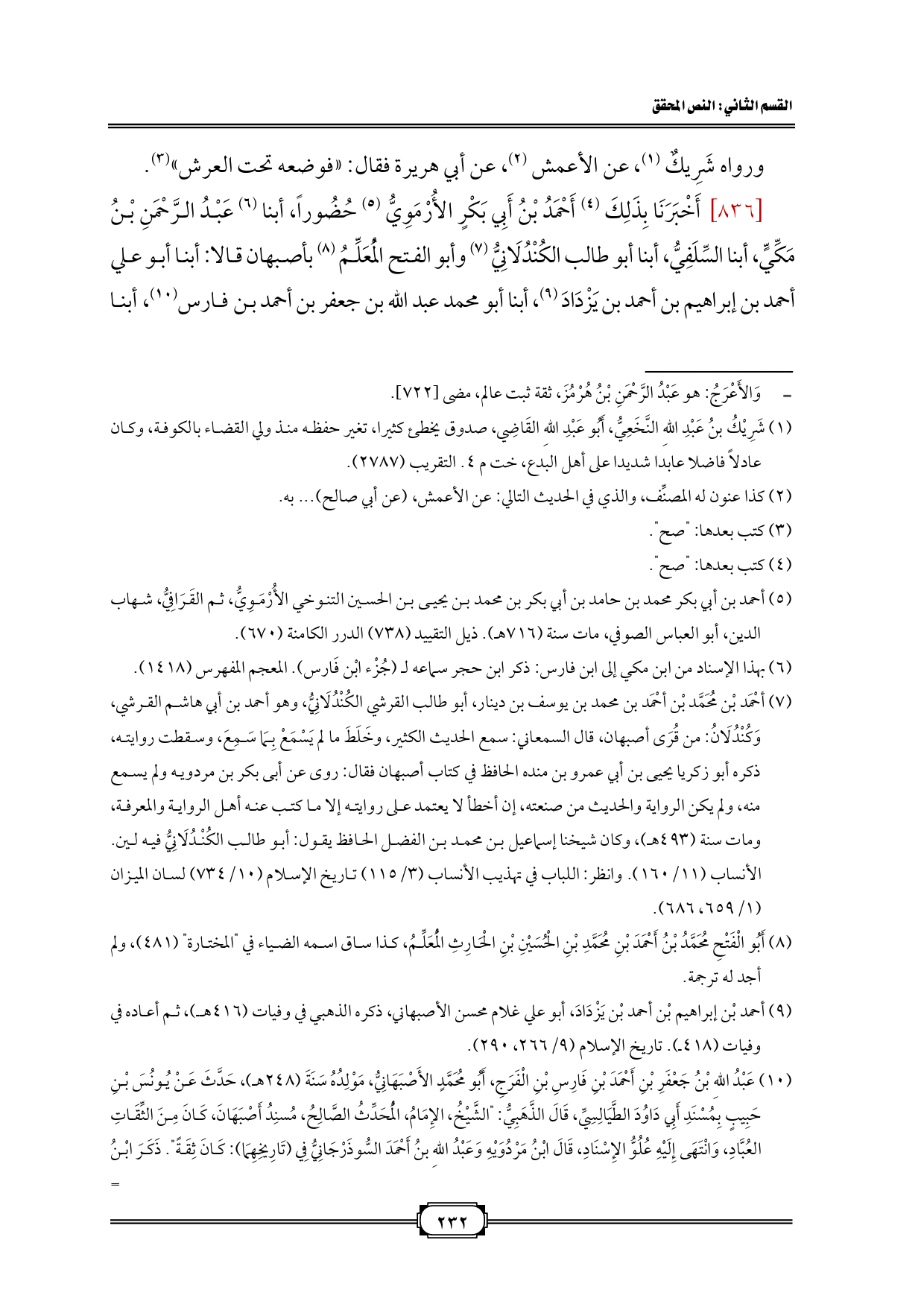 [836] أَخْبَرَنَا بِذَلِكَ (¬4) أَحْمَدُ بْنُ أَبِي بَكْرٍ الأُرْمَوِيُّ (¬5) حُضُوراً، أبنا (¬6) عَبْدُ الرَّحْمَنِ بْنُ مَكِّيٍّ، أبنا السِّلَفِيُّ، أبنا أبو طالب الكُنْدُلَانِيُّ (¬7) وأبو الفتح الْمُعَلِّمُ (¬8) بأصبهان قالا: أبنا أبو علي أحمد بن إبراهيم بن أحمد بن يَزْدَادَ (¬9)، أبنا أبو محمد عبد الله بن جعفر بن أحمد بن فارس (¬10)، أبنا