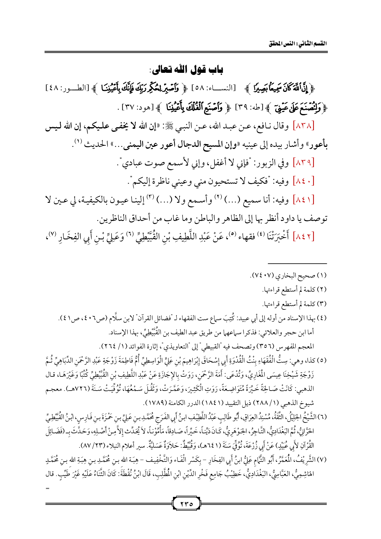 [841] وفيه: أنا سميع ( ... ) (¬2) وأسمع ولا ( ... ) (¬3) إلينا عيون بالكيفية، لي عين لا توصف يا داود أنظر بها إلى الظاهر والباطن وما غاب من أحداق الناظرين.