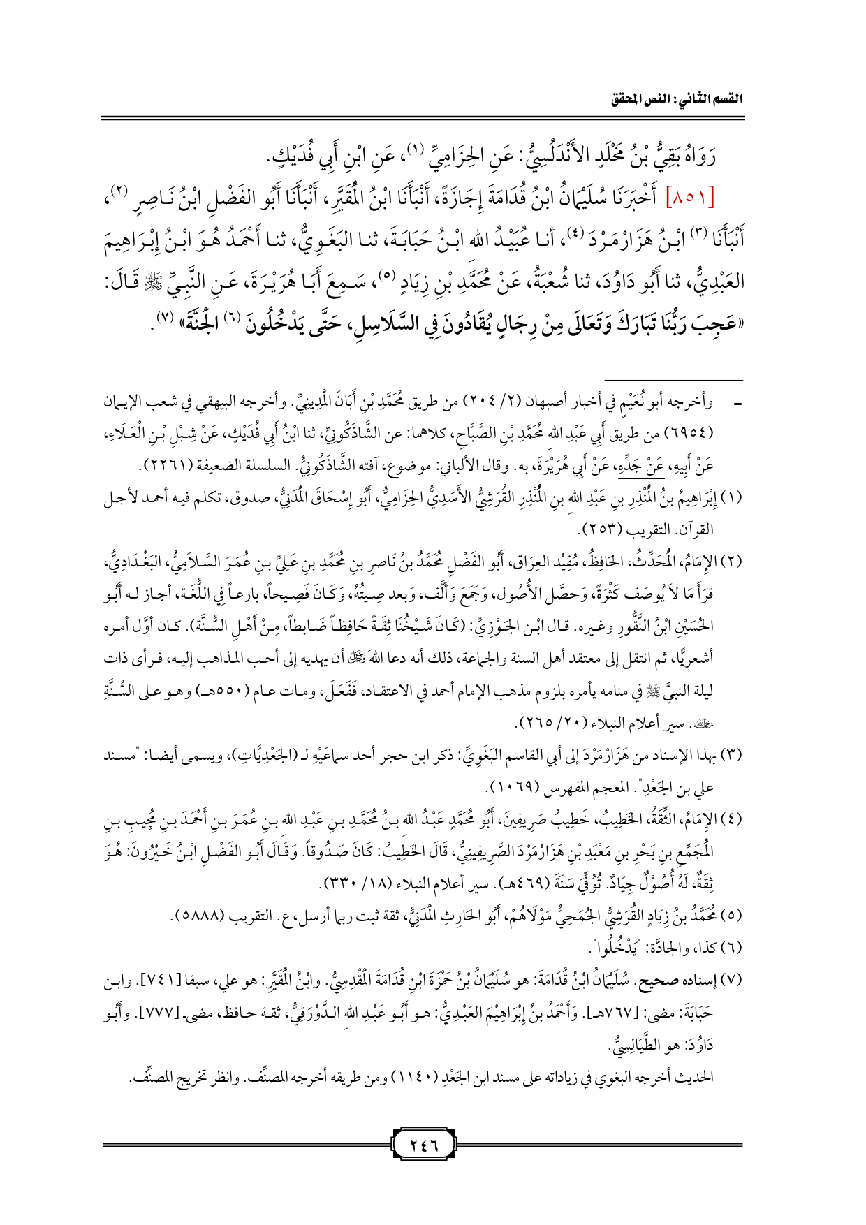[851] أَخْبَرَنَا سُلَيْمَانُ ابْنُ قُدَامَةَ إِجَازَةً، أَنْبَأَنَا ابْنُ الْمُقَيَّرِ، أَنْبَأَنَا أَبُو الفَضْلِ ابْنُ نَاصِرٍ (¬2)، أَنْبَأَنَا (¬3) ابْنُ هَزَارْمَرْدَ (¬4)، أنا عُبَيْدُ اللهِ ابْنُ حَبَابَةَ، ثنا البَغَوِيُّ، ثنا أَحْمَدُ هُوَ ابْنُ إِبْرَاهِيمَ العَبْدِيُّ، ثنا أَبُو دَاوُدَ، ثنا شُعْبَةُ، عَنْ مُحَمَّدِ بْنِ زِيَادٍ (¬5)، سَمِعَ أَبَا هُرَيْرَةَ، عَنِ النَّبِيِّ - صلى الله عليه وسلم - قَالَ: «عَجِبَ رَبُّنَا تَبَارَكَ وَتَعَالَى مِنْ رِجَالٍ يُقَادُونَ فِي السَّلَاسِلِ، حَتَّى يَدْخُلُونَ (¬6) الْجَنَّةَ» (¬7).
