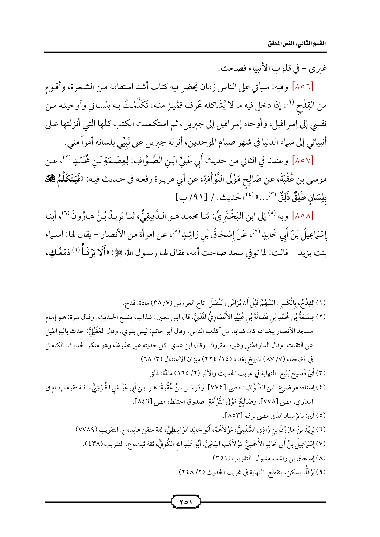 [857] وعندنا في الثاني من حديث أَبِي عَلِيِّ ابْنِ الصَّوَّافِ: لِعِصْمَةِ بْنِ مُحَمَّدٍ (¬2)، عن موسى بن عُقْبَةَ، عن صَالِحٍ مَوْلَى التَّوْأَمَةِ، عن أبي هريرة رفعه في حديث فيه: «فَيَتَكَلَّمُ - عز وجل - بِلِسَانٍ طَلِقٌ ذَلِقٌ (¬3) ... » (¬4) الحديث. / [91/ب]