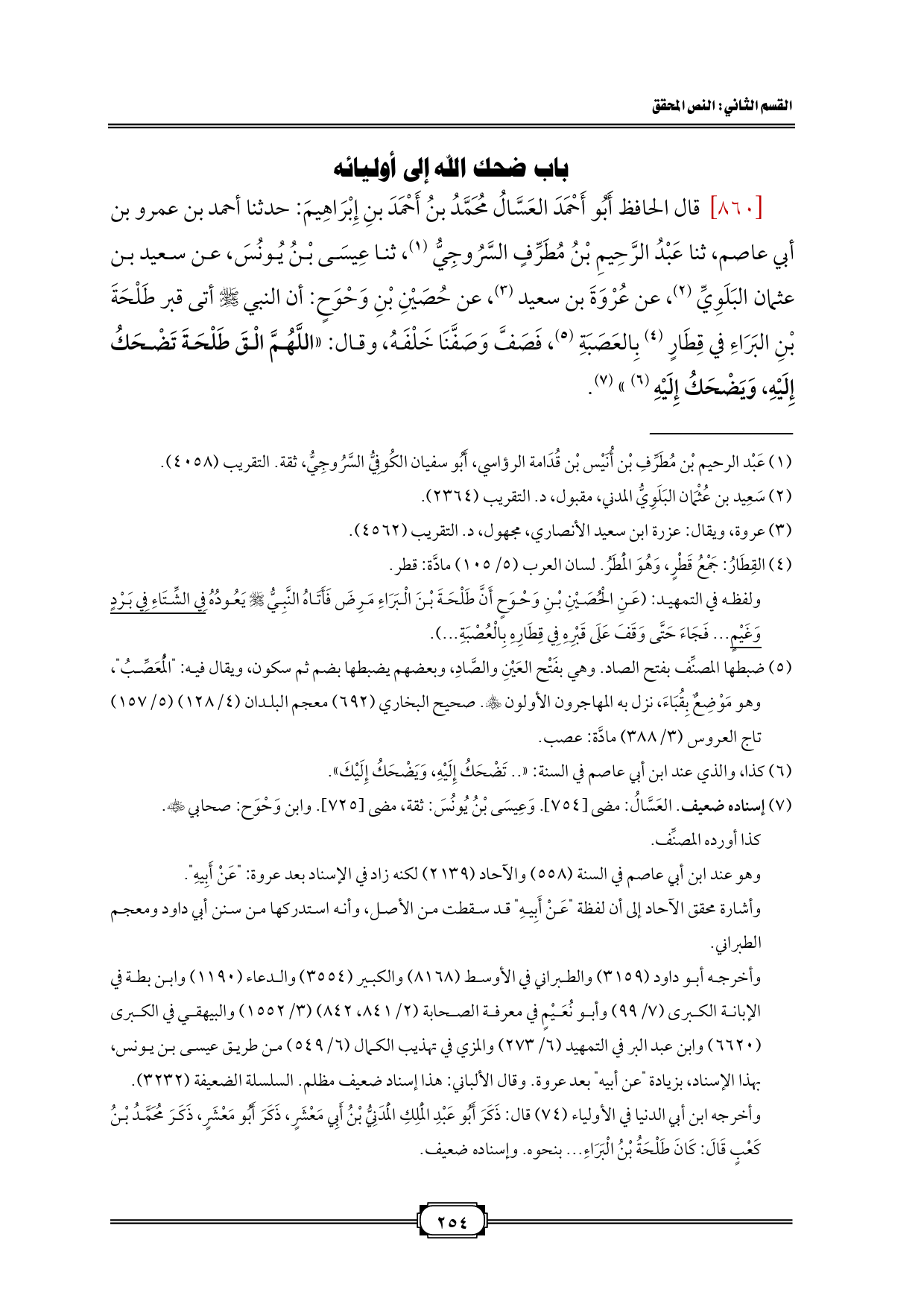 [860] قال الحافظ أَبُو أَحْمَدَ العَسَّالُ مُحَمَّدُ بنُ أَحْمَدَ بنِ إِبْرَاهِيمَ: حدثنا أحمد بن عمرو بن أبي عاصم، ثنا عَبْدُ الرَّحِيمِ بْنُ مُطَرِّفٍ السَّرُوجِيُّ (¬1)، ثنا عِيسَى بْنُ يُونُسَ، عن سعيد بن عثمان البَلَوِيِّ (¬2)، عن عُرْوَةَ بن سعيد (¬3)، عن حُصَيْنِ بْنِ وَحْوَحٍ: أن النبي - صلى الله عليه وسلم - أتى قبر طَلْحَةَ بْنِ البَرَاءِ في قِطَارٍ (¬4) بِالعَصَبَةِ (¬5)، فَصَفَّ وَصَفَّنَا خَلْفَهُ، وقال: «اللَّهُمَّ الْقَ طَلْحَةَ تَضْحَكُ إِلَيْهِ، وَيَضْحَكُ إِلَيْهِ (¬6)» (¬7).