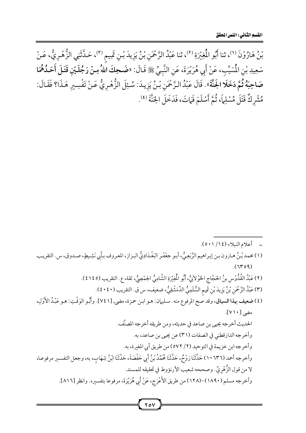 بْنُ هَارُوْنَ (¬1)، ثنا أَبُو الْمُغِيْرَةِ (¬2)، ثنا عَبْدُ الرَّحْمَنِ بْنُ يَزِيدَ بْنِ تَمِيمٍ (¬3)، حَدَّثَنِي الزُّهْرِيُّ، عَنْ سَعِيدِ بْنِ الْمُسَيِّبِ، عَنْ أَبِي هُرَيْرَةَ، عَنِ النَّبِيِّ - صلى الله عليه وسلم - قَالَ: «ضَحِكَ اللهُ مِنْ رَجُلَيْنِ قَتَلَ أَحَدُهُمَا صَاحِبَهُ ثُمَّ دَخَلَا الجَنَّةَ». قَالَ عَبْدُ الرَّحْمَنِ بْنُ يَزِيدَ: سُئِلَ الزُّهْرِيُّ عَنْ تَفْسِيرِ هَذَا؟ فَقَالَ: مُشْرِكٌ قَتَلَ مُسْلِماً، ثُمَّ أَسْلَمَ فَمَاتَ، فَدَخَلَ الجَنَّةَ (¬4).