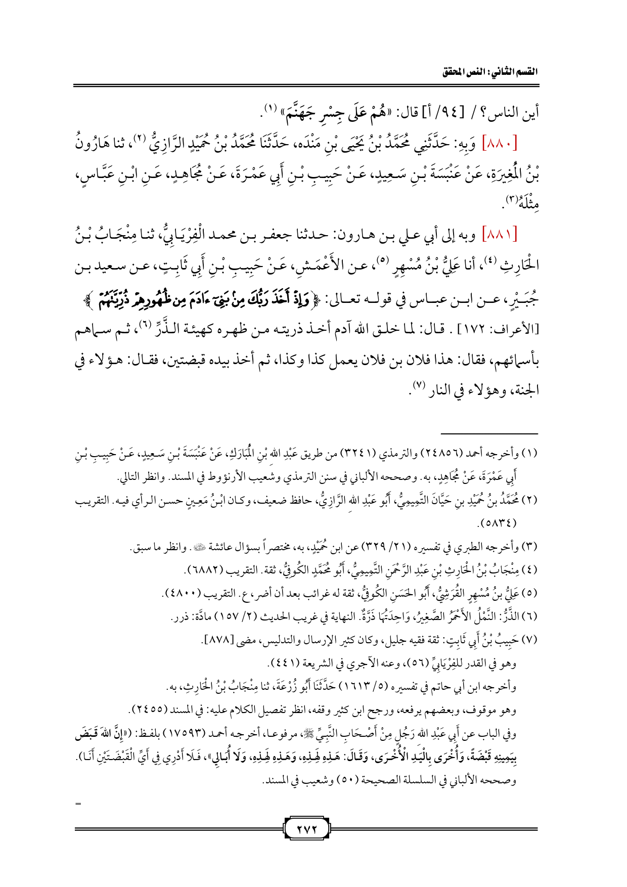 [881] وبه إلى أبي علي بن هارون: حدثنا جعفر بن محمد الْفِرْيَابِيُّ، ثنا مِنْجَابُ بْنُ الْحَارِثِ (¬4)، أنا عَلِيُّ بْنُ مُسْهِرٍ (¬5)، عن الأَعْمَشِ، عَنْ حَبِيبِ بْنِ أَبِي ثَابِتٍ، عن سعيد بن جُبَيْرٍ، عن ابن عباس في قوله تعالى: {وَإِذْ أَخَذَ رَبُّكَ مِنْ بَنِي آدَمَ مِنْ ظُهُورِهِمْ ذُرِّيَّتَهُمْ} [الأعراف: 172]. قال: لما خلق الله آدم أخذ ذريته من ظهره كهيئة الذَّرِّ (¬6)، ثم سماهم بأسمائهم، فقال: هذا فلان بن فلان يعمل كذا وكذا، ثم أخذ بيده قبضتين، فقال: هؤلاء في الجنة، وهؤلاء في النار (¬7).