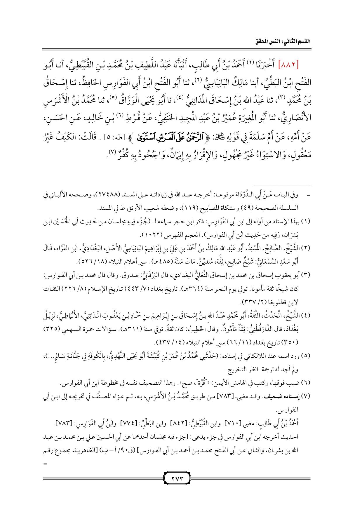 [882] أَخْبَرَنَا (¬1) أَحْمَدُ بْنُ أَبِي طَالِبٍ، أَنْبَأَنَا عَبْدُ اللَّطِيفِ بْنُ مُحَمَّدِ بْنِ القُبَّيْطِيُّ، أنا أَبُو الفَتْحِ ابْنُ البَطِّيِّ، أبنا مَالِكٌ البَانِيَاسِيُّ (¬2)، ثنا أَبُو الفَتْحِ ابْنُ أَبِي الفَوَارِسِ الحَافِظُ، ثنا إِسْحَاقُ بْنُ مُحَمَّدٍ (¬3)، ثنا عَبْدُ اللهِ بْنُ إِسْحَاقَ الْمَدَائِنِيُّ (¬4)، نا أَبُو يَحْيَى الْوَرَّاقُ (¬5)، ثنا مُحَمَّدُ بْنُ الْأَشْرَسِ الأَنْصَارِيُّ، ثنا أَبُو الْمُغِيرَةِ عُمَيْرُ بْنُ عَبْدِ الْمَجِيدِ الحَنَفِيُّ، عَنْ قُرْطِ (¬6) بْنِ خَالِدٍ، عَنِ الحَسَنِ، عَنْ أُمِّهِ، عَنْ أُمِّ سَلَمَةَ فِي قَوْلِهِ - عز وجل -: {الرَّحْمَنُ عَلَى الْعَرْشِ اسْتَوَى} [طه: 5]. قَالَتْ: الكَيْفُ غَيْرُ مَعْقُولٍ، وَالاسْتِوَاءُ غَيْرُ مَجْهُولٍ، وَالإِقْرَارُ بِهِ إِيمَانٌ، وَالجُحُودُ بِهِ كُفْرٌ (¬7).