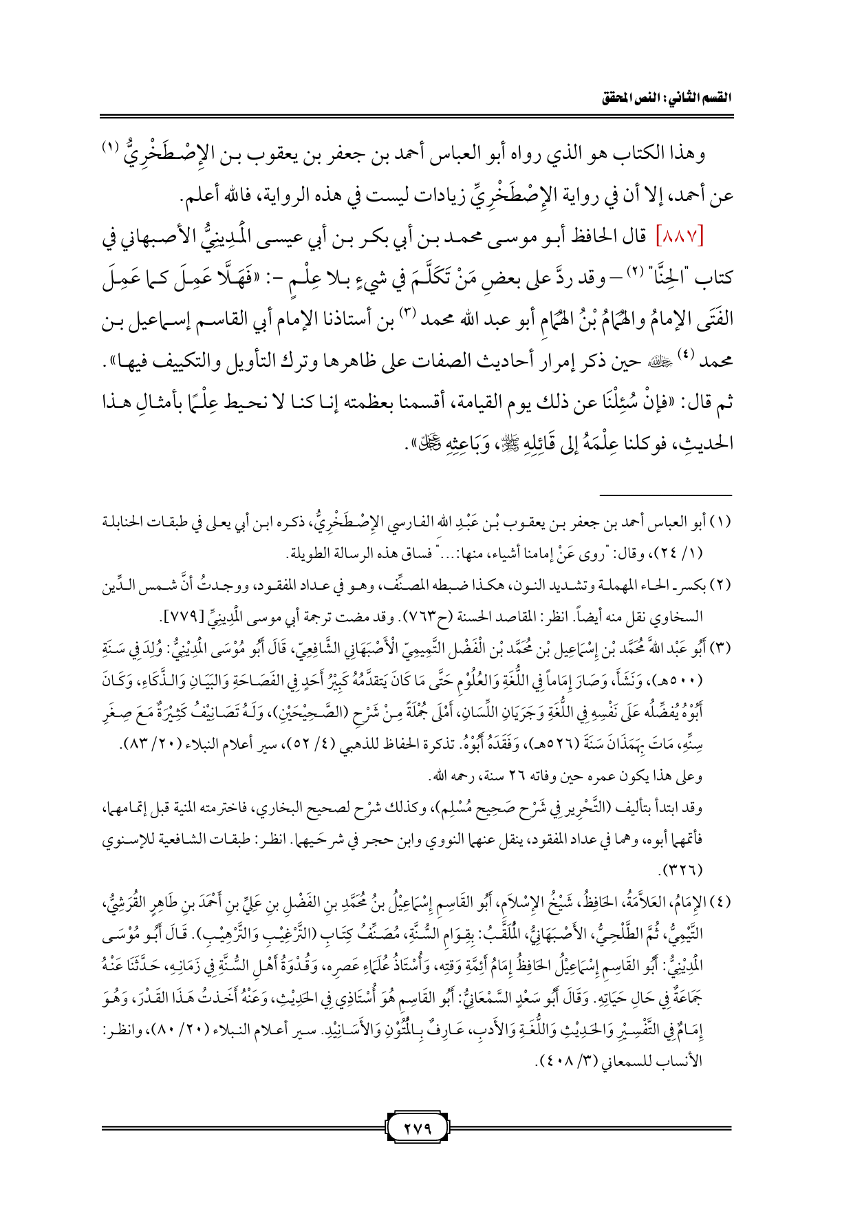 (¬1) أبو العباس أحمد بن جعفر بن يعقوب بْن عَبْدِ اللهِ الفارسي الإِصْطَخْرِيُّ، ذكره ابن أبي يعلى في طبقات الحنابلة (1/ 24)، وقال: "روى عَنْ إمامنا أشياء، منها: ... " فساق هذه الرسالة الطويلة.
