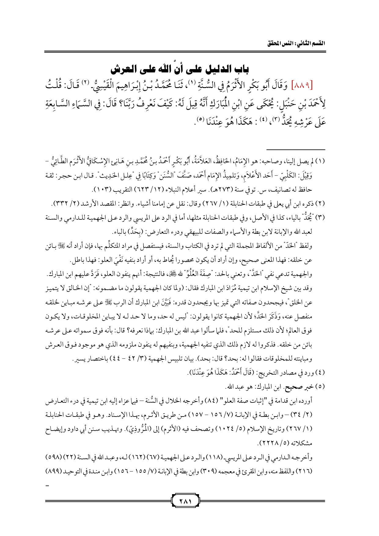 [889] وَقَالَ أَبُو بَكْرٍ الأَثْرَمُ فِي السُّنَّةِ (¬1)، ثَنَا مُحَمَّدُ بْنُ إِبْرَاهِيمَ الْقَيْسِيُّ (¬2) قَالَ: قُلْتُ لِأَحْمَدَ بْنِ حَنْبَلٍ: يُحْكَى عَنِ ابْنِ الْمُبَارَكِ أَنَّهُ قِيلَ لَهُ: كَيْفَ نَعْرِفُ رَبَّنَا؟ قَالَ: فِي السَّمَاءِ السَّابِعَةِ عَلَى عَرْشِهِ يُحَدُّ (¬3)، (¬4): هَكَذَا هُوَ عِنْدَنَا (¬5).