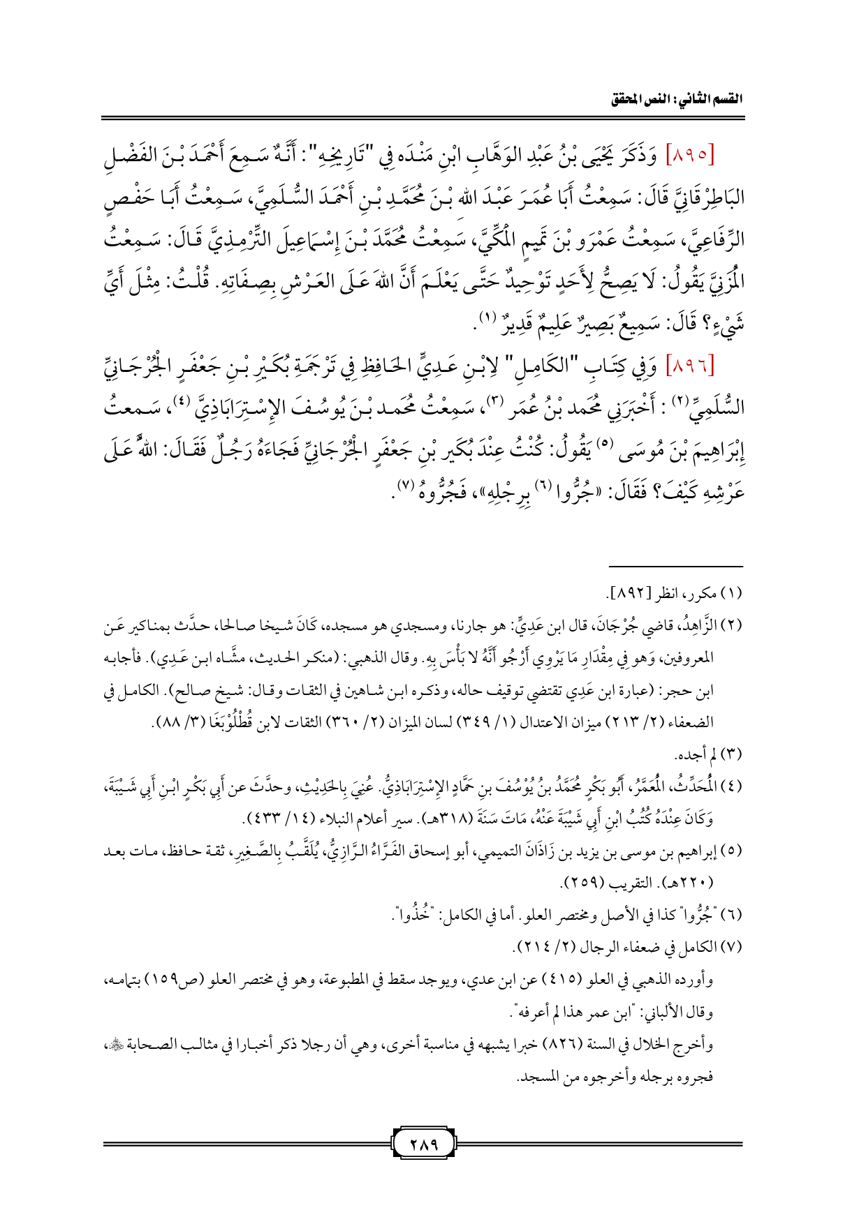 [896] وَفِي كِتَابِ "الكَامِلِ" لِابْنِ عَدِيٍّ الحَافِظِ فِي تَرْجَمَةِ بُكَيْرِ بْنِ جَعْفَرٍ الْجُرْجَانِيِّ السُّلَمِيِّ (¬2): أَخْبَرَنِي مُحَمد بْنُ عُمَر (¬3)، سَمِعْتُ مُحَمد بْنَ يُوسُفَ الإِسْتِرَابَاذِيَّ (¬4)، سَمعتُ إِبْرَاهِيمَ بْنَ مُوسَى (¬5) يَقُولُ: كُنْتُ عِنْدَ بُكَير بْنِ جَعْفَرٍ الْجُرْجَانِيِّ فَجَاءَهُ رَجُلٌ فَقَالَ: اللَّهُ عَلَى عَرْشِهِ كَيْفَ؟ فَقَالَ: «جُرُّوا (¬6) بِرِجْلِهِ»، فَجُرُّوهُ (¬7).