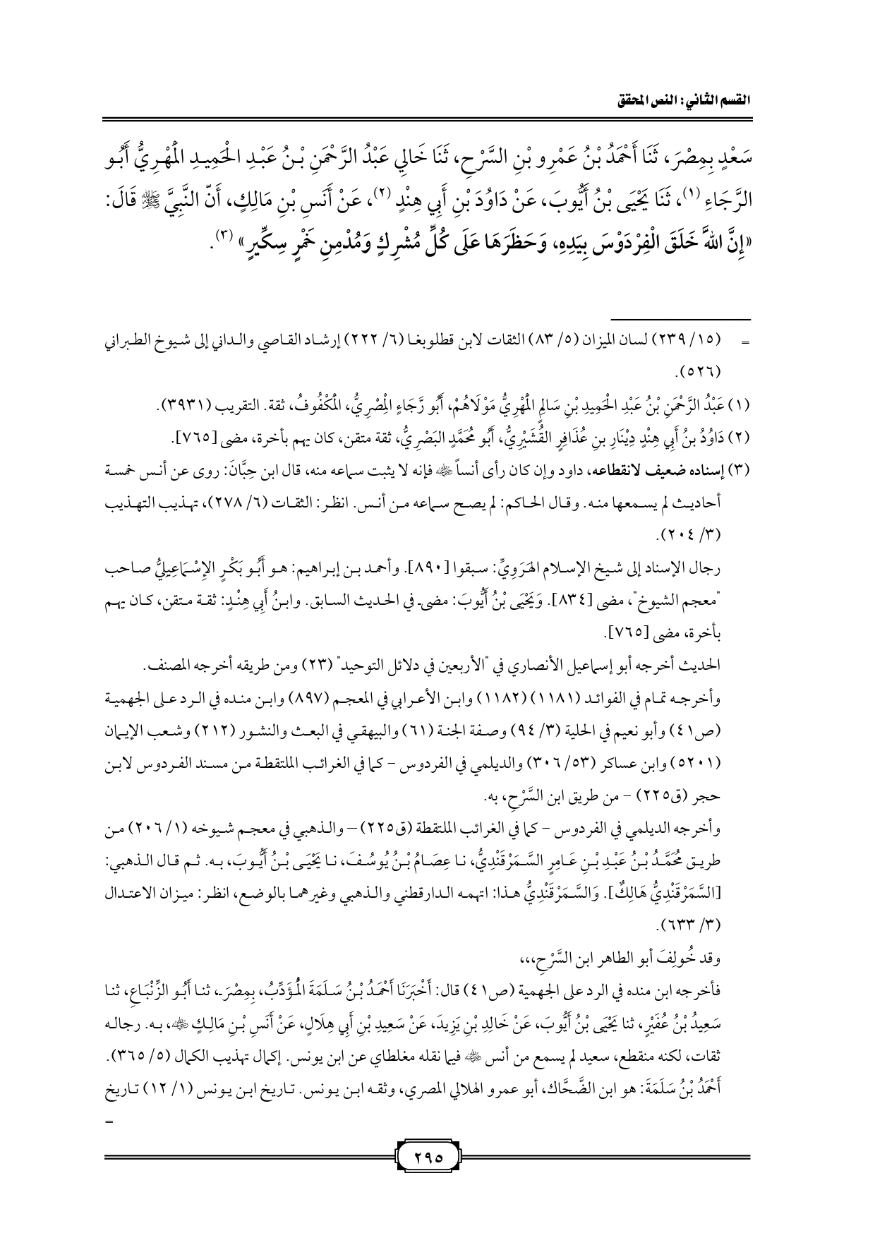 سَعْدٍ بِمِصْرَ، ثَنَا أَحْمَدُ بْنُ عَمْرِو بْنِ السَّرْحِ، ثَنَا خَالِي عَبْدُ الرَّحْمَنِ بْنُ عَبْدِ الْحَمِيدِ الْمَهْرِيُّ أَبُو الرَّجَاءِ (¬1)، ثَنَا يَحْيَى بْنُ أَيُّوبَ، عَنْ دَاوُدَ بْنِ أَبِي هِنْدٍ (¬2)، عَنْ أَنَسِ بْنِ مَالِكٍ، أَنّ النَّبِيَّ - صلى الله عليه وسلم - قَالَ: «إِنَّ اللَّهَ خَلَقَ الْفِرْدَوْسَ بِيَدِهِ، وَحَظَرَهَا عَلَى كُلِّ مُشْرِكٍ وَمُدْمِنِ خَمْرٍ سِكِّيرٍ» (¬3).