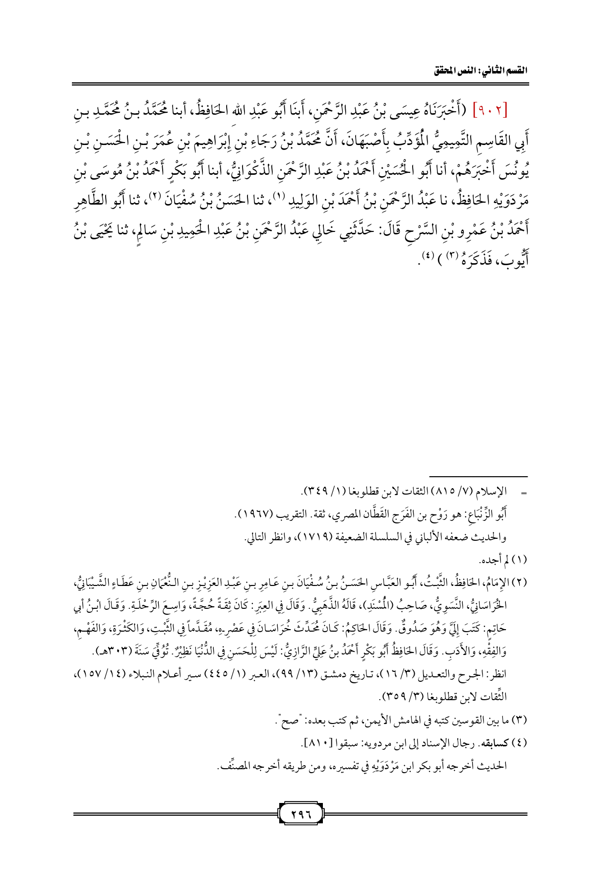 [902] (أَخْبَرَنَاهُ عِيسَى بْنُ عَبْدِ الرَّحْمَنِ، أَبنَا أَبُو عَبْدِ اللهِ الحَافِظُ، أبنا مُحَمَّدُ بنُ مُحَمَّدِ بنِ أَبِي القَاسِمِ التَّمِيمِيُّ الْمُؤَدِّبُ بِأَصْبَهَانَ، أَنَّ مُحَمَّدُ بْنُ رَجَاءِ بْنِ إِبْرَاهِيمَ بْنِ عُمَرَ بْنِ الْحَسَنِ بْنِ يُونُسَ أَخْبَرَهُمْ، أنا أَبُو الْحُسَيْنِ أَحْمَدُ بْنُ عَبْدِ الرَّحْمَنِ الذَّكْوَانِيُّ، أبنا أَبُو بَكْرٍ أَحْمَدُ بْنُ مُوسَى بْنِ مَرْدَوَيْهِ الحَافِظُ، نا عَبْدُ الرَّحْمَنِ بْنُ أَحْمَدَ بْنِ الوَلِيدِ (¬1)، ثنا الحَسَنُ بْنُ سُفْيَانَ (¬2)، ثنا أَبُو الطَّاهِرِ أَحْمَدُ بْنُ عَمْرِو بْنِ السَّرْحِ قَالَ: حَدَّثَنِي خَالِي عَبْدُ الرَّحْمَنِ بْنُ عَبْدِ الْحَمِيدِ بْنِ سَالِمٍ، ثنا يَحْيَى بْنُ أَيُّوبَ، فَذَكَرَهُ (¬3)) (¬4).