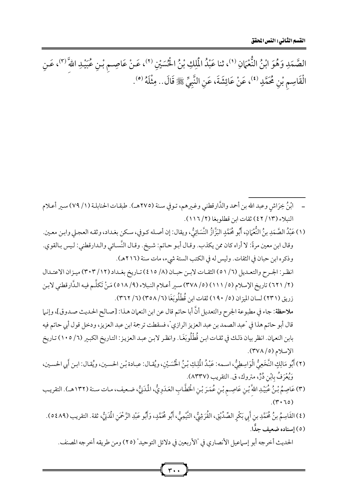 الصَّمَدِ وَهُوَ ابْنُ النُّعْمَانِ (¬1)، ثنا عَبْدُ الْمَلِكِ بْنُ الْحُسَيْنِ (¬2)، عَنْ عَاصِمِ بْنِ عُبَيْدِ اللَّهِ (¬3)، عَنِ الْقَاسِمِ بْنِ مُحَمَّدٍ (¬4)، عَنْ عَائِشَةَ، عَنِ النَّبِيِّ - صلى الله عليه وسلم - قَالَ .. مِثْلَهُ (¬5).