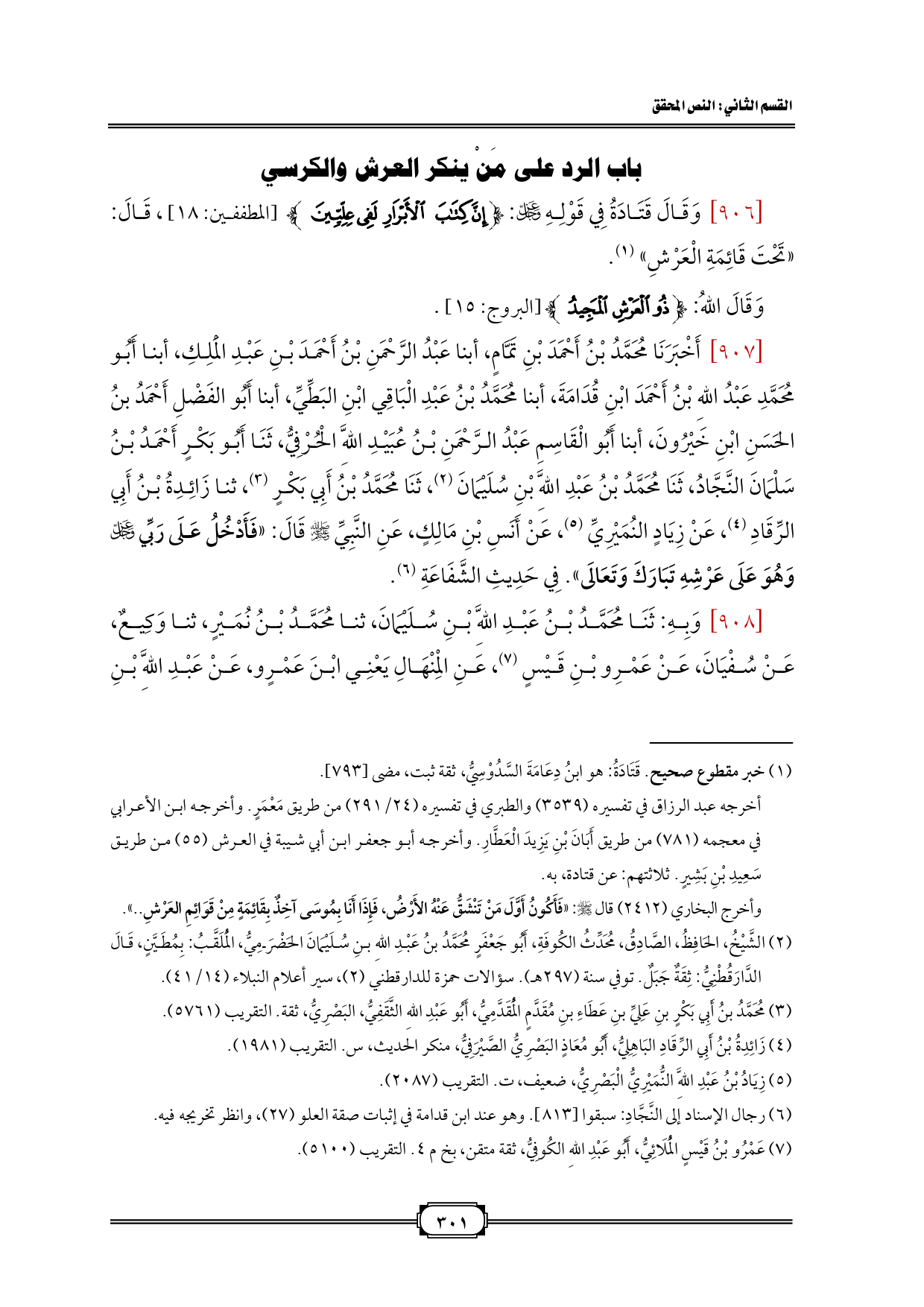 [906] وَقَالَ قَتَادَةُ فِي قَوْلِهِ - عز وجل -: {إِنَّ كِتَابَ الْأَبْرَارِ لَفِي عِلِّيِّينَ} [المطففين: 18]، قَالَ: «تَحْتَ قَائِمَةِ الْعَرْشِ» (¬1).