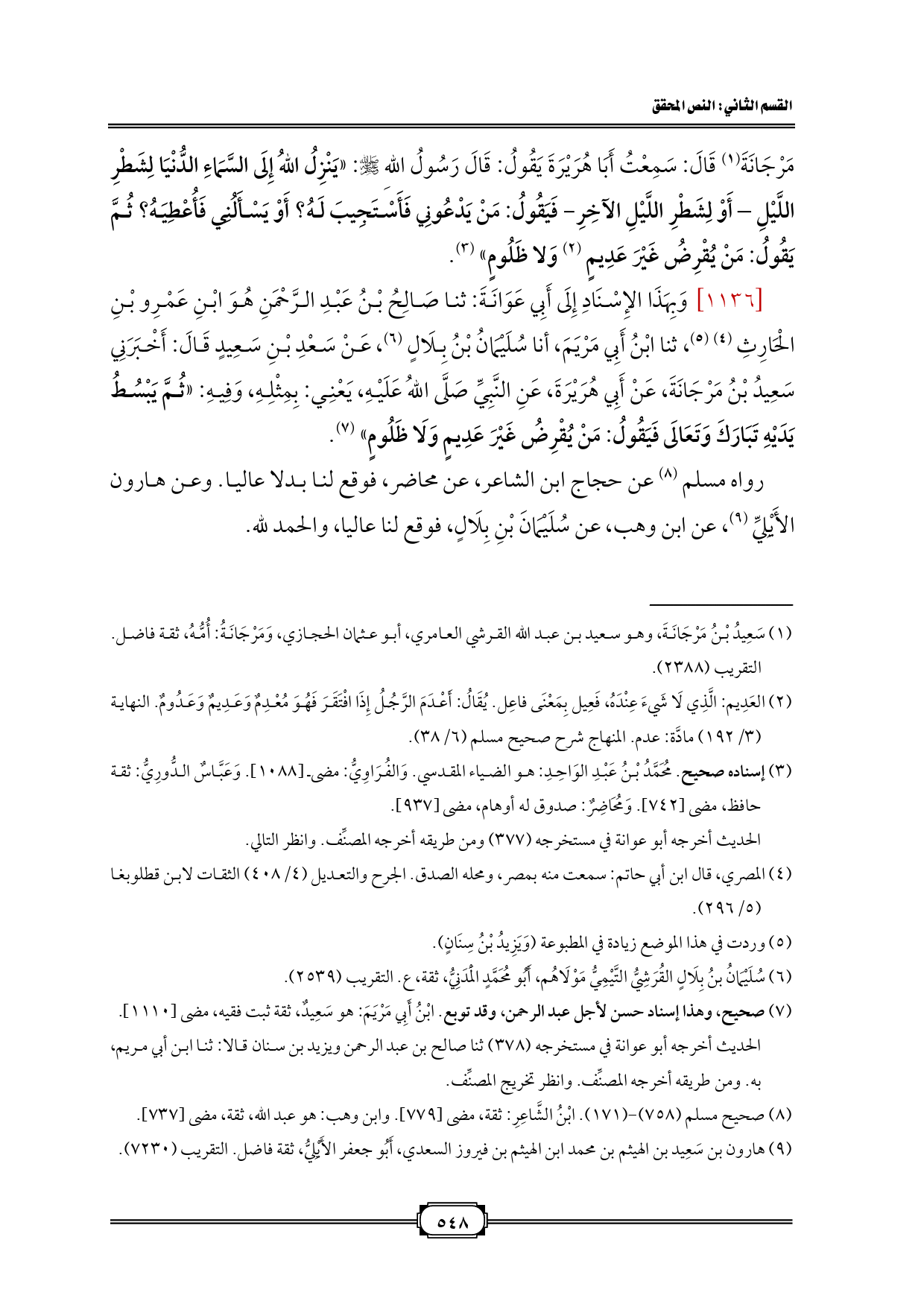 [1136] وَبِهَذَا الإِسْنَادِ إِلَى أَبِي عَوَانَةَ: ثنا صَالِحُ بْنُ عَبْدِ الرَّحْمَنِ هُوَ ابْنِ عَمْرِو بْنِ الْحَارِثِ (¬4) (¬5)، ثنا ابْنُ أَبِي مَرْيَمَ، أنا سُلَيْمَانُ بْنُ بِلَالٍ (¬6)، عَنْ سَعْدِ بْنِ سَعِيدٍ قَالَ: أَخْبَرَنِي سَعِيدُ بْنُ مَرْجَانَةَ، عَنْ أَبِي هُرَيْرَةَ، عَنِ النَّبِيِّ صَلَّى اللهُ عَلَيْهِ، يَعْنِي: بِمِثْلِهِ، وَفِيهِ: «ثُمَّ يَبْسُطُ يَدَيْهِ تَبَارَكَ وَتَعَالَى فَيَقُولُ: مَنْ يُقْرِضُ غَيْرَ عَدِيمٍ وَلَا ظَلُومٍ» (¬7).