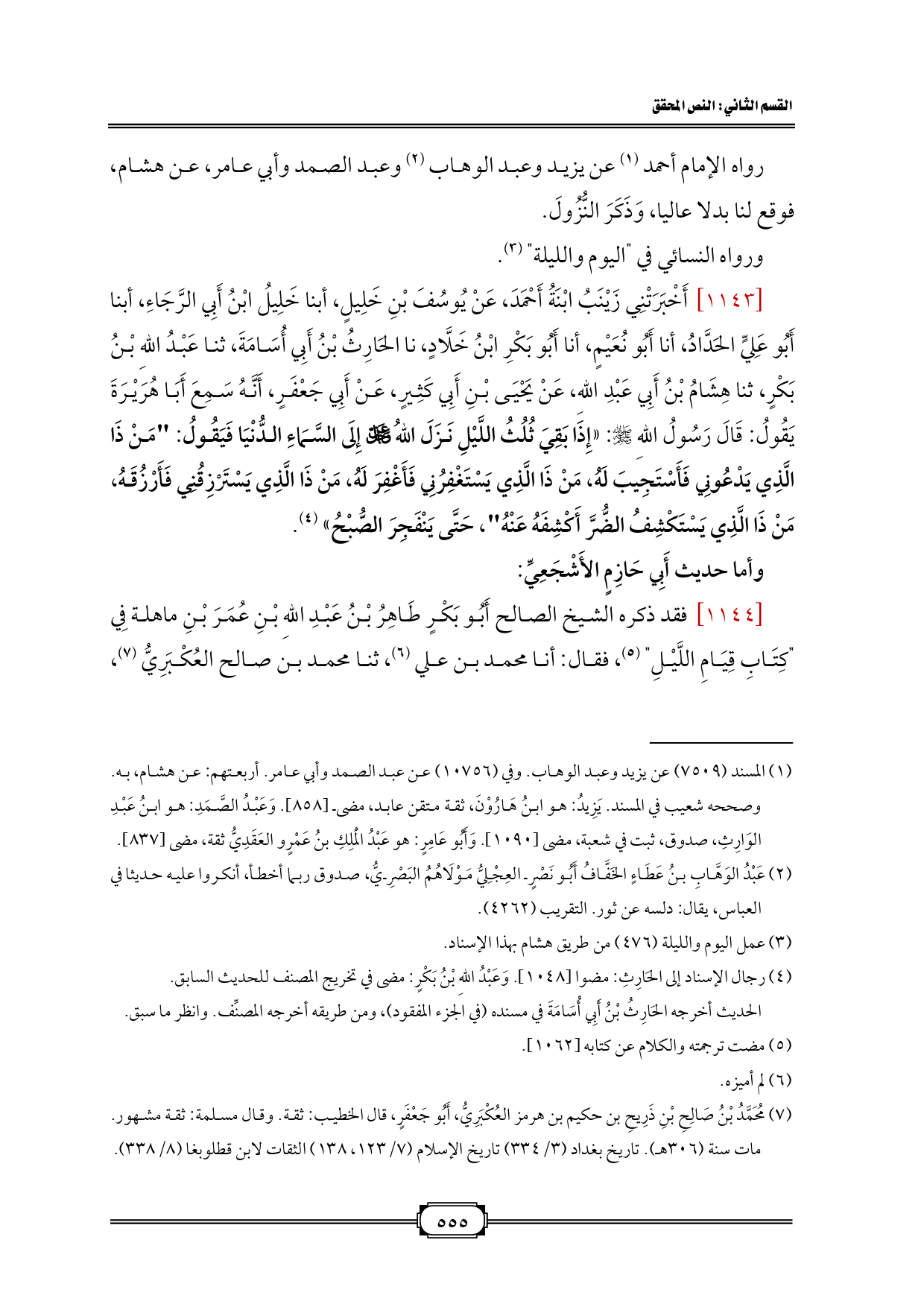 [1143] أَخْبَرَتْنِي زَيْنَبُ ابْنَةُ أَحْمَدَ، عَنْ يُوسُفَ بْنِ خَلِيلٍ، أبنا خَلِيلُ ابْنُ أَبِي الرَّجَاءِ، أبنا أَبُو عَلِيٍّ الحَدَّادُ، أنا أَبُو نُعَيْمٍ، أنا أَبُو بَكْرِ ابْنُ خَلَّادٍ، نا الحَارِثُ بْنُ أَبِي أُسَامَةَ، ثنا عَبْدُ اللهِ بْنُ بَكْرٍ، ثنا هِشَامُ بْنُ أَبِي عَبْدِ اللهِ، عَنْ يَحْيَى بْنِ أَبِي كَثِيرٍ، عَنْ أَبِي جَعْفَرٍ، أَنَّهُ سَمِعَ أَبَا هُرَيْرَةَ يَقُولُ: قَالَ رَسُولُ اللهِ - صلى الله عليه وسلم -: «إِذَا بَقِيَ ثُلُثُ اللَّيْلِ نَزَلَ اللهُ - عز وجل - إِلَى السَّمَاءِ الدُّنْيَا فَيَقُولُ: "مَنْ ذَا الَّذِي يَدْعُونِي فَأَسْتَجِيبَ لَهُ، مَنْ ذَا الَّذِي يَسْتَغْفِرُنِي فَأَغْفِرَ لَهُ، مَنْ ذَا الَّذِي يَسْتَرْزِقُنِي فَأَرْزُقَهُ، مَنْ ذَا الَّذِي يَسْتَكْشِفُ الضُّرَّ أَكْشِفَهُ عَنْهُ"، حَتَّى يَنْفَجِرَ الصُّبْحُ» (¬4).