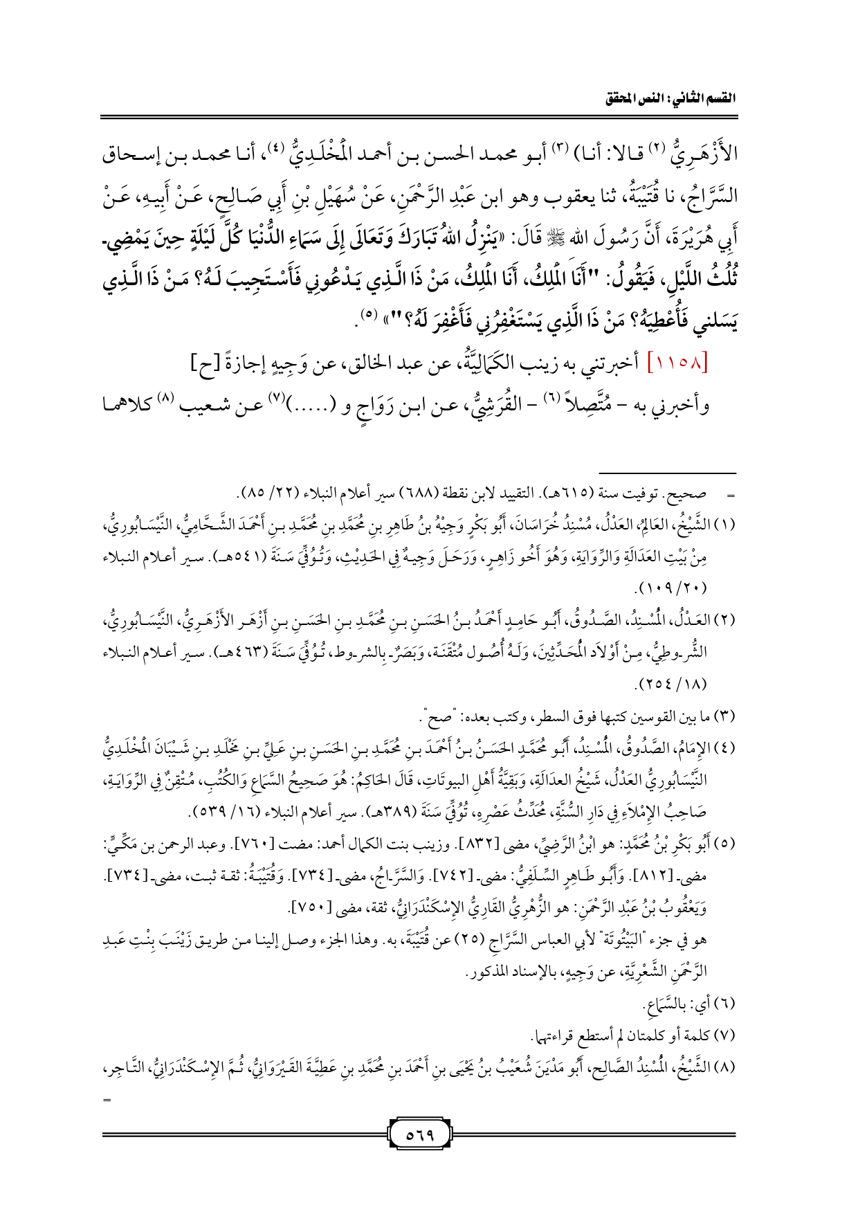 الأَزْهَرِيُّ (¬1) قالا: أنا) (¬2) أبو محمد الحسن بن أحمد الْمَخْلَدِيُّ (¬3)، أنا محمد بن إسحاق السَّرَّاجُ، نا قُتَيْبَةُ، ثنا يعقوب وهو ابن عَبْدِ الرَّحْمَنِ، عَنْ سُهَيْلِ بْنِ أَبِي صَالِحٍ، عَنْ أَبِيهِ، عَنْ أَبِي هُرَيْرَةَ، أَنَّ رَسُولَ اللهِ - صلى الله عليه وسلم - قَالَ: «يَنْزِلُ اللهُ تَبَارَكَ وَتَعَالَى إِلَى سَمَاءِ الدُّنْيَا كُلَّ لَيْلَةٍ حِينَ يَمْضِي ثُلُثُ اللَّيْلِ، فَيَقُولُ: "أَنَا الْمَلِكُ، أَنَا الْمَلِكُ، مَنْ ذَا الَّذِي يَدْعُونِي فَأَسْتَجِيبَ لَهُ؟ مَنْ ذَا الَّذِي يَسَلني فَأُعْطِيَهُ؟ مَنْ ذَا الَّذِي يَسْتَغْفِرُنِي فَأَغْفِرَ لَهُ؟ "» (¬4).