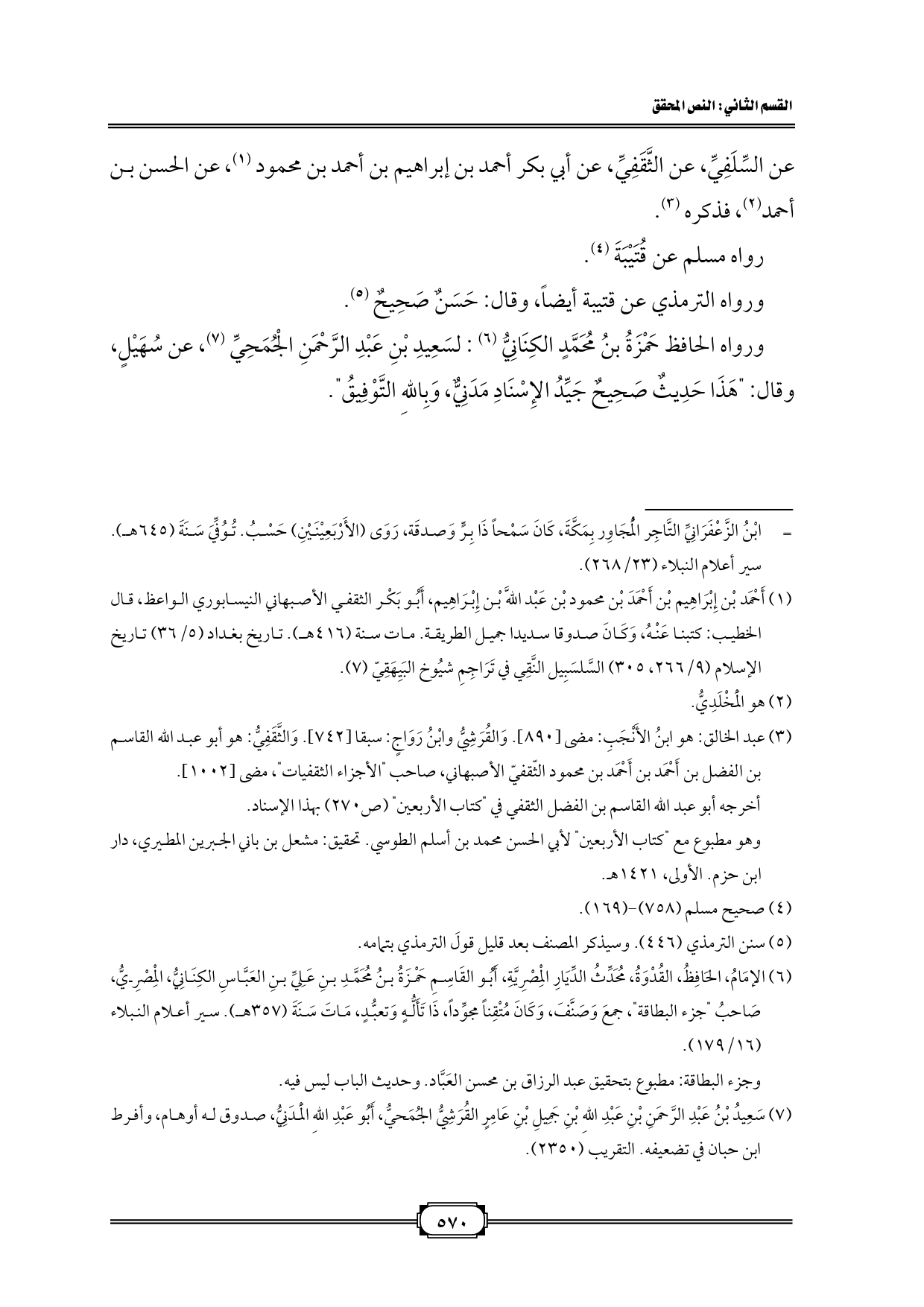 (¬6) الإمَامُ، الحَافِظُ، القُدْوَةُ، مُحَدِّثُ الدِّيَارِ الْمِصْرِيَّةِ، أَبُو القَاسِمِ حَمْزَةُ بنُ مُحَمَّدِ بنِ عَلِيِّ بنِ العَبَّاسِ الكِنَانِيُّ، الْمِصْرِيُّ، صَاحبُ "جزء البطاقة"، جمعَ وَصَنَّفَ، وَكَانَ مُتْقِناً مجوِّداً، ذَا تَأَلُّهٍ وَتعبُّدٍ، مَاتَ سَنَةَ (357 هـ). سير أعلام النبلاء (16/ 179).