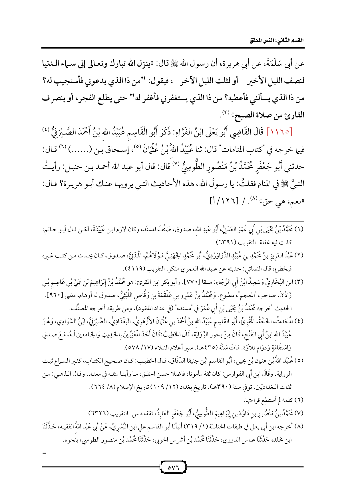 [1165] قَالَ القَاضِي أَبُو يَعْلَى ابْنُ الفَرَّاءِ: ذَكَرَ أَبُو الْقَاسِمِ عُبَيْدُ اللهِ بْنُ أَحْمَدَ الصَّيْرَفِيُّ (¬2) فيما خرجه في "كتاب المنامات" قال: ثنا عُبَيْدُ اللَّهِ بْنُ عُثْمَانَ (¬3)، إسحاق بن ( ...... ) (¬4) قال: حدثني أَبُو جَعْفَرٍ مُحَمَّدُ بْنُ مَنْصُورٍ الطُّوسِيُّ (¬5) قال: قال أبو عبد الله أحمد بن حنبل: رأيتُ النبيَّ - صلى الله عليه وسلم - في المنام فقلتُ: يا رسولَ الله، هذه الأحاديث التي يرويها عنك أبو هريرة؟ قال: «نعم، هي حق» (¬6). / [126/أ]