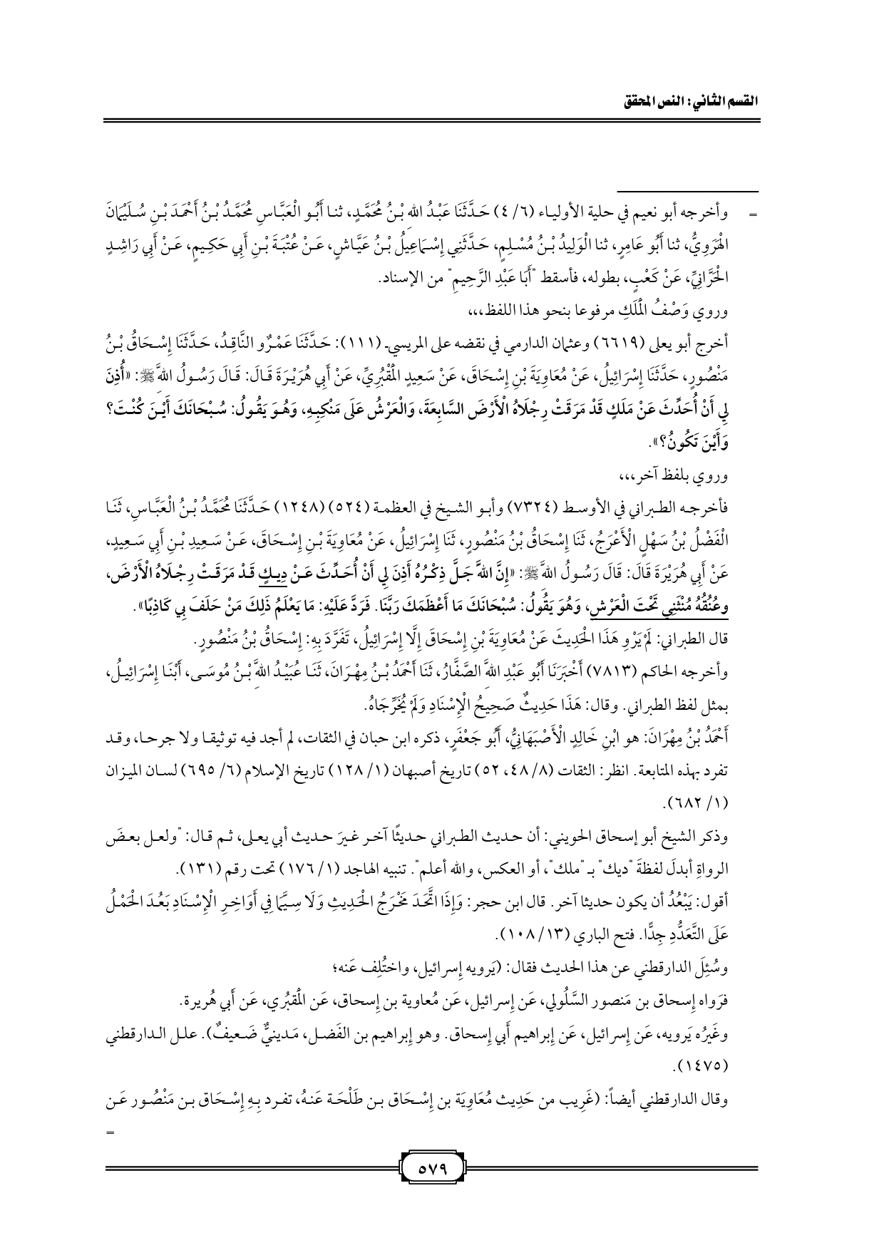 أخرج أبو يعلى (6619) وعثمان الدارمي في نقضه على المريسي (111): حَدَّثَنَا عَمْرٌو النَّاقِدُ، حَدَّثَنَا إِسْحَاقُ بْنُ مَنْصُورٍ، حَدَّثَنَا إِسْرَائِيلُ، عَنْ مُعَاوِيَةَ بْنِ إِسْحَاقَ، عَنْ سَعِيدٍ الْمَقْبُرِيِّ، عَنْ أَبِي هُرَيْرَةَ قَالَ: قَالَ رَسُولُ اللَّهِ - صلى الله عليه وسلم -: «أُذِنَ لِي أَنْ أُحَدِّثَ عَنْ مَلَكٍ قَدْ مَرَقَتْ رِجْلَاهُ الْأَرْضَ السَّابِعَةَ، وَالْعَرْشُ عَلَى مَنْكِبِهِ، وَهُوَ يَقُولُ: سُبْحَانَكَ أَيْنَ كُنْتَ؟ وَأَيْنَ تَكُونُ؟ ».