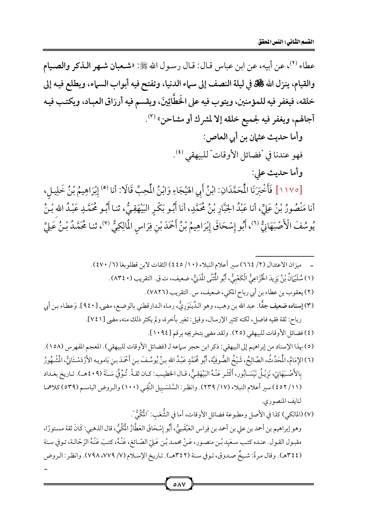 عطاء (¬1)، عن أبيه، عن ابن عباس قال: قال رسول الله - صلى الله عليه وسلم -: «شعبان شهر الذكر والصيام والقيام، ينزل الله - عز وجل - في ليلة النصف إلى سماء الدنيا، وتفتح فيه أبواب السماء، ويطلع فيه إلى خلقه، فيغفر فيه للمؤمنين، ويتوب فيه على الخَطَّائِينَ، ويقسم فيه أرزاق العباد، ويكتب فيه آجالهم، ويغفر فيه لجميع خلقه إلا لمشرك أو مشاحن» (¬2).