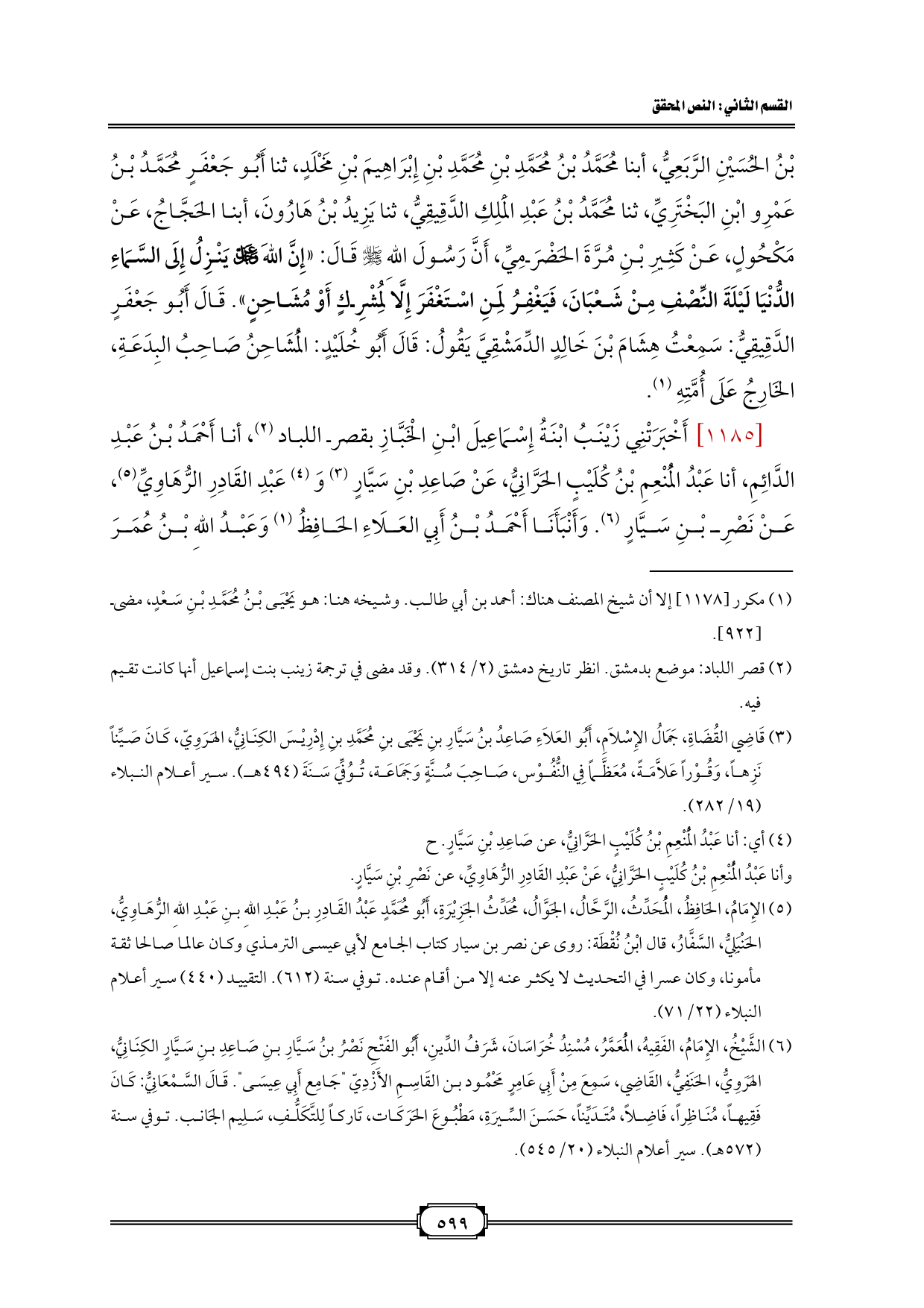 [1185] أَخْبَرَتْنِي زَيْنَبُ ابْنَةُ إِسْمَاعِيلَ ابْنِ الْخَبَّازِ بقصر اللباد (¬2)، أنا أَحْمَدُ بْنُ عَبْدِ الدَّائِمِ، أنا عَبْدُ الْمُنْعِمِ بْنُ كُلَيْبٍ الحَرَّانِيُّ، عَنْ صَاعِدِ بْنِ سَيَّارٍ (¬3) وَ (¬4) عَبْدِ القَادِرِ الرُّهَاوِيِّ (¬5)، عَنْ نَصْرِ بْنِ سَيَّارٍ (¬6). وَأَنْبَأَنَا أَحْمَدُ بْنُ أَبِي العَلَاءِ الحَافِظُ (¬7) وَعَبْدُ اللهِ بْنُ عُمَرَ