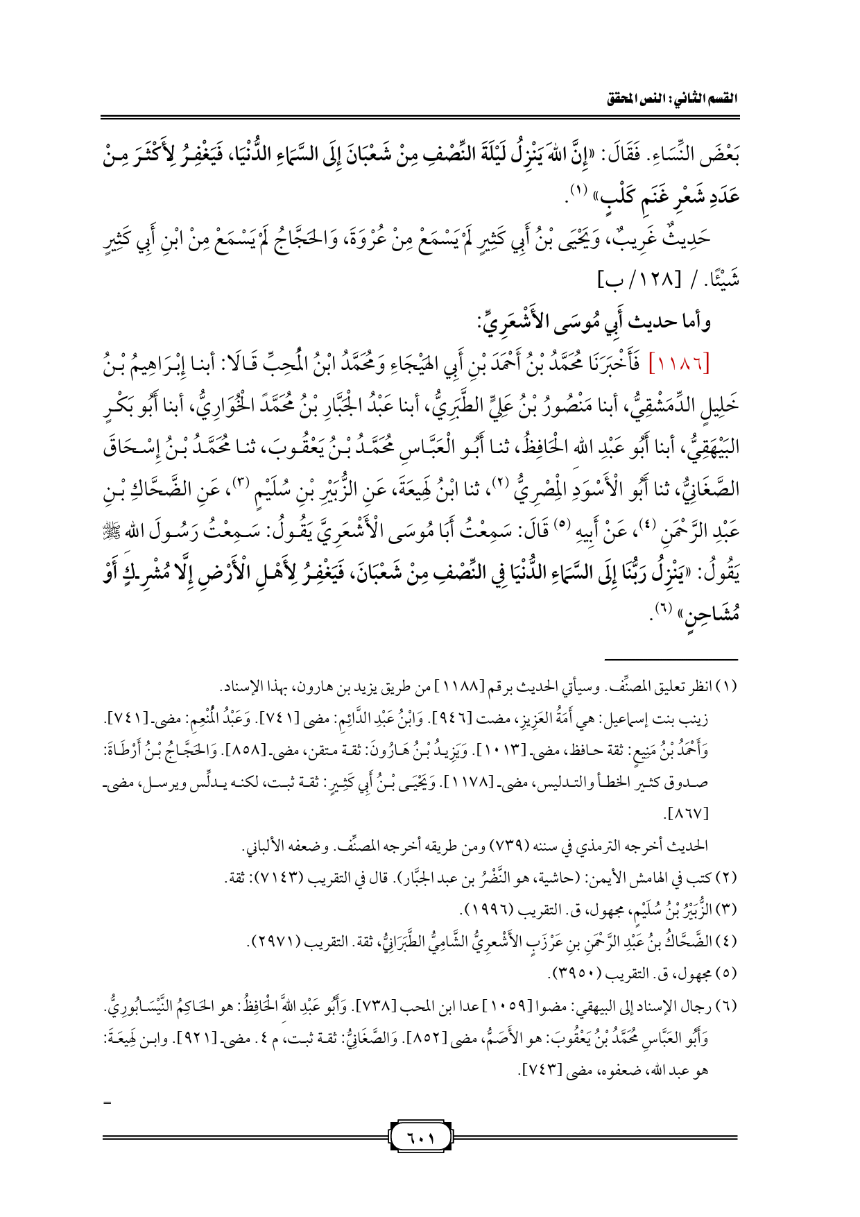 [1186] فَأَخْبَرَنَا مُحَمَّدُ بْنُ أَحْمَدَ بْنِ أَبِي الهَيْجَاءِ وَمُحَمَّدُ ابْنُ الْمُحِبِّ قَالَا: أبنا إِبْرَاهِيمُ بْنُ خَلِيلٍ الدِّمَشْقِيُّ، أبنا مَنْصُورُ بْنُ عَلِيٍّ الطَّبَرِيُّ، أبنا عَبْدُ الْجَبَّارِ بْنُ مُحَمَّدً الْخُوَارِيُّ، أبنا أَبُو بَكْرٍ البَيْهَقِيُّ، أبنا أَبُو عَبْدِ اللهِ الْحَافِظُ، ثنا أَبُو الْعَبَّاسِ مُحَمَّدُ بْنُ يَعْقُوبَ، ثنا مُحَمَّدُ بْنُ إِسْحَاقَ الصَّغَانِيُّ، ثنا أَبُو الْأَسْوَدِ الْمِصْرِيُّ (¬2)، ثنا ابْنُ لَهِيعَةَ، عَنِ الزُّبَيْرِ بْنِ سُلَيْمٍ (¬3)، عَنِ الضَّحَّاكِ بْنِ عَبْدِ الرَّحْمَنِ (¬4)، عَنْ أَبِيهِ (¬5) قَالَ: سَمِعْتُ أَبَا مُوسَى الْأَشْعَرِيَّ يَقُولُ: سَمِعْتُ رَسُولَ اللهِ - صلى الله عليه وسلم - يَقُولُ: «يَنْزِلُ رَبُّنَا إِلَى السَّمَاءِ الدُّنْيَا فِي النِّصْفِ مِنْ شَعْبَانَ، فَيَغْفِرُ لِأَهْلِ الْأَرْضِ إِلَّا مُشْرِكٍ أَوْ مُشَاحِنٍ» (¬6).
