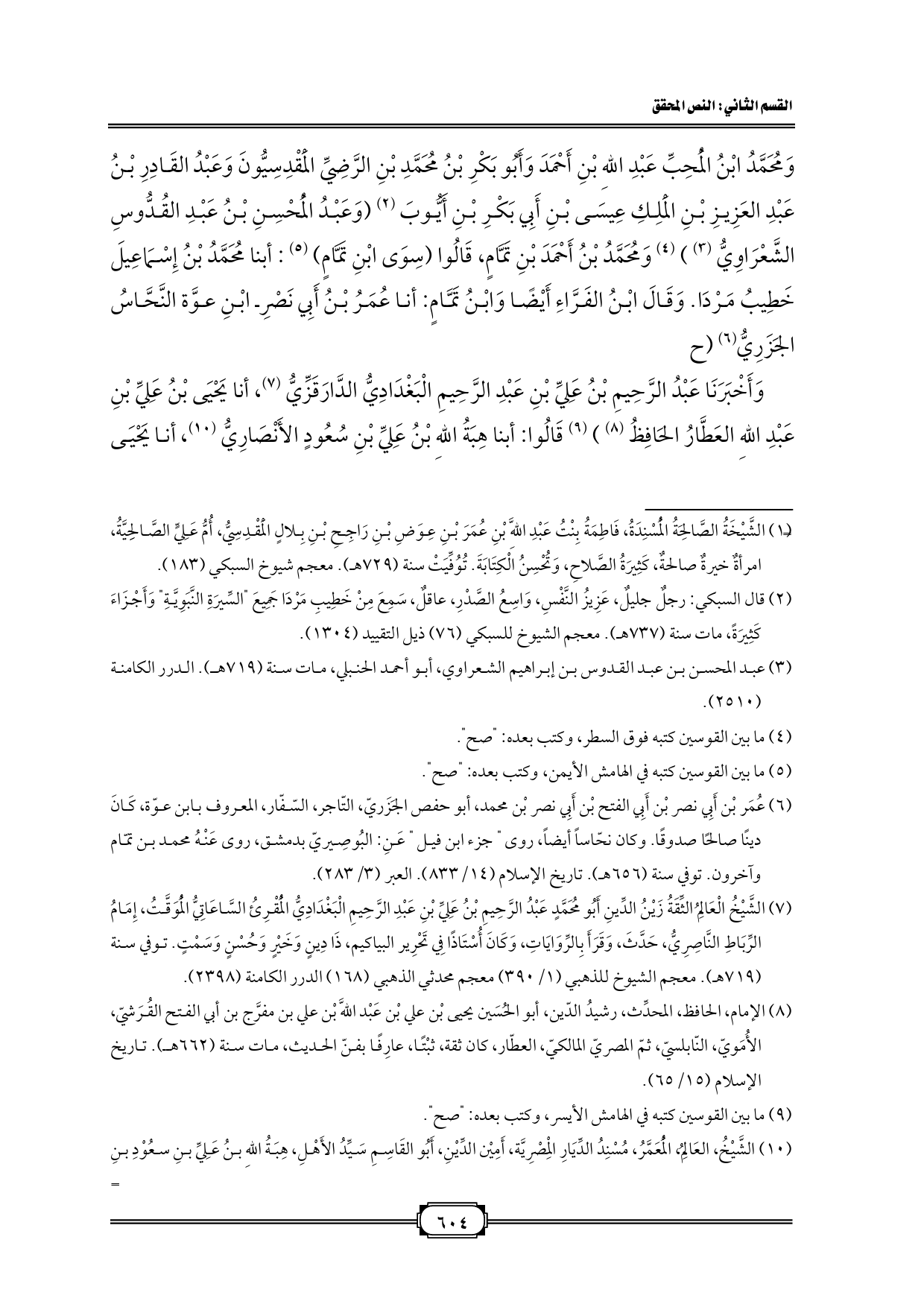 وَمُحَمَّدُ ابْنُ الْمُحِبِّ عَبْدِ اللهِ بْنِ أَحْمَدَ وَأَبُو بَكْرِ بْنُ مُحَمَّدِ بْنِ الرَّضِيِّ الْمَقْدِسِيُّونَ وَعَبْدُ القَادِرِ بْنُ عَبْدِ العَزِيزِ بْنِ الْمَلِكِ عِيسَى بْنِ أَبِي بَكْرِ بْنِ أَيُّوبَ (¬1) (وَعَبْدُ الْمُحْسِنِ بْنُ عَبْدِ القُدُّوسِ الشَّعْرَاوِيُّ (¬2)) (¬3) وَمُحَمَّدُ بْنُ أَحْمَدَ بْنِ تَمَّامٍ، قَالُوا (سِوَى ابْنِ تَمَّامٍ) (¬4): أبنا مُحَمَّدُ بْنُ إِسْمَاعِيلَ خَطِيبُ مَرْدَا. وَقَالَ ابْنُ الفَرَّاءِ أَيْضًا وَابْنُ تَمَّامٍ: أنا عُمَرُ بْنُ أَبِي نَصْرِ ابْنِ عوَّة النَّحَّاسُ الجَزَرِيُّ (¬5) (ح