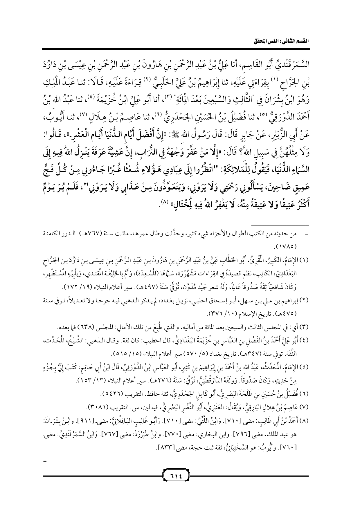 السَّمَرْقَنْديِّ أَبُو القَاسِمِ، أنا عَلِيُّ بْنُ عَبْدِ الرَّحْمَنِ بْنِ هَارُونَ بْنِ عَبْدِ الرَّحْمَنِ بْنِ عِيْسَى بْنِ دَاوُدَ بْنِ الجَرَّاحِ (¬1) بِقِرَاءَتِي عَلَيْهِ، ثنا إِبْرَاهِيمُ بْنُ عَلِيٍّ الحَلَبِيُّ (¬2) قِرَاءَةً عَلَيْهِ، قَالَا: ثنا عَبْدُ الْمَلِكِ وَهُوَ ابْنُ بِشْرَانَ فِي "الثَّالِثِ وَالسَّبْعِينَ بَعْدَ الْمِائَةِ" (¬3)، أنا أَبُو عَلِيِّ ابْنُ خُزَيْمَةَ (¬4)، ثنا عَبْدُ اللهِ بْنُ أَحْمَدَ الدَّوْرَقِيُّ (¬5)، ثنا فُضَيْلُ بْنُ الحُسَيْنِ الجَحْدَرِيُّ (¬6)، ثنا عَاصِمُ بْنُ هِلَالٍ (¬7)، ثنا أَيُّوبُ، عَنْ أَبِي الزُّبَيْرِ، عَنْ جَابِرٍ قَالَ: قَالَ رَسُولُ اللهِ - صلى الله عليه وسلم -: «إِنَّ أَفْضَلَ أَيَّامِ الدُّنْيَا أَيَّام الْعَشْرِ»، قَالُوا: وَلَا مِثْلُهُنَّ فِي سَبِيلِ اللَّهِ؟ قَالَ: «إِلَّا مَنْ عَفَّرَ وَجْهَهُ فِي التُّرَابِ، إِنَّ عَشِيَّةَ عَرَفَةَ يَنْزِلُ اللهُ فِيهِ إِلَى السَّمَاءِ الدُّنْيَا، فَيَقُولُ لِلْمَلائِكَةِ: "انْظُرُوا إِلَى عِبَادِي هَؤُلاءِ شُعْثًا غُبْرًا جَاءُونِي مِنْ كُلِّ فَجٍّ عَمِيقٍ ضَاحِينَ، يَسْأَلُونِي رَحْمَتِي وَلَا يَرَوْنِي، وَيَتَعَوَّذُونَ مِنْ عَذَابِي وَلَا يَرَوْنِي"، فَلَمْ يُرَ يَوْمٌ أَكْثَرُ عَتِيقًا وَلا عَتِيقَةً مِنْهُ، لَا يَغْفِرُ اللهُ فِيهِ لِمُخْتَالٍ» (¬8).