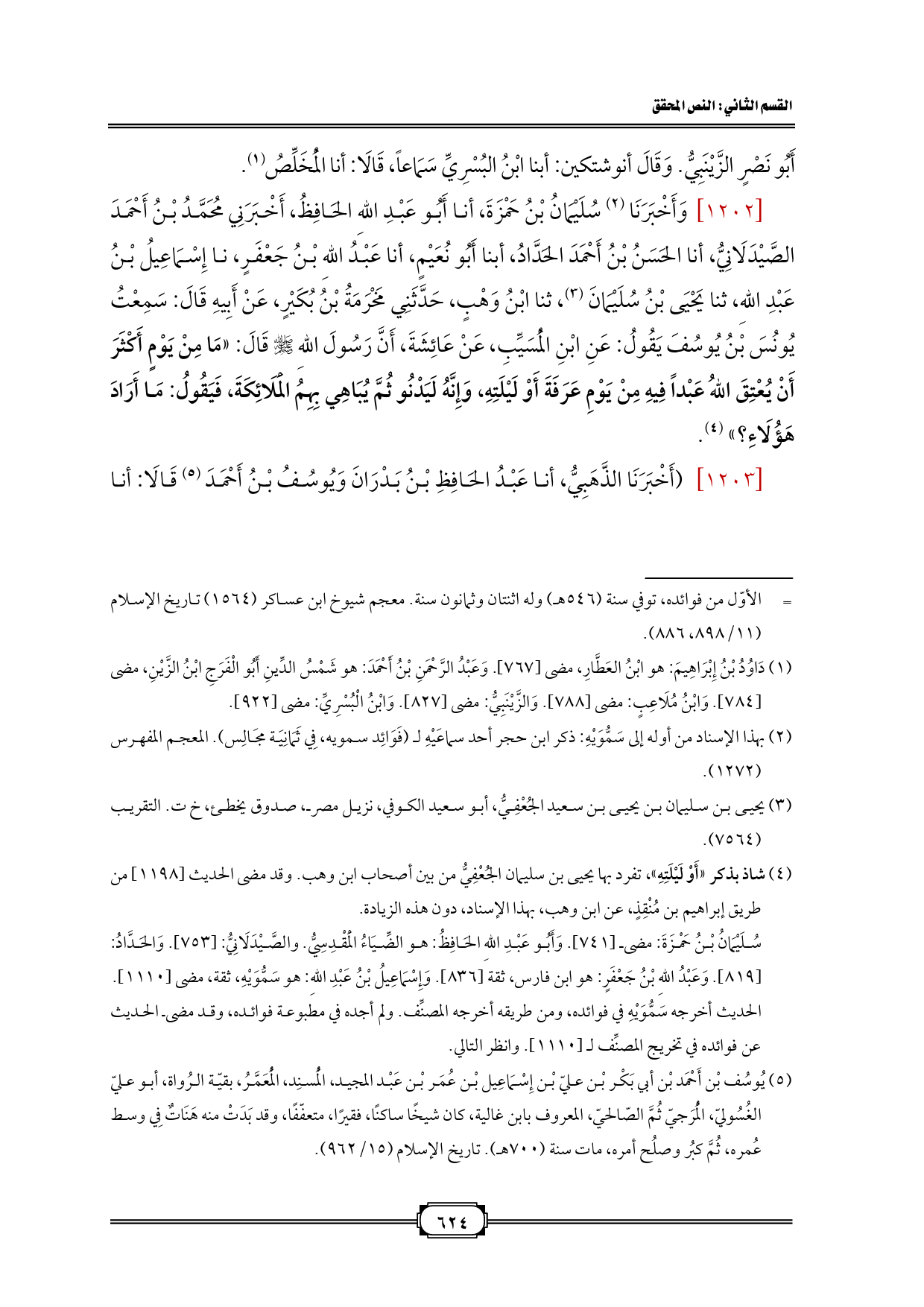 [1202] وَأَخْبَرَنَا (¬2) سُلَيْمَانُ بْنُ حَمْزَةَ، أنا أَبُو عَبْدِ اللهِ الحَافِظُ، أَخْبَرَنِي مُحَمَّدُ بْنُ أَحْمَدَ الصَّيْدَلَانِيُّ، أنا الحَسَنُ بْنُ أَحْمَدَ الحَدَّادُ، أبنا أَبُو نُعَيْمٍ، أنا عَبْدُ اللهِ بْنُ جَعْفَرٍ، نا إِسْمَاعِيلُ بْنُ عَبْدِ اللهِ، ثنا يَحْيَى بْنُ سُلَيْمَانَ (¬3)، ثنا ابْنُ وَهْبٍ، حَدَّثَنِي مَخْرَمَةُ بْنُ بُكَيْرٍ، عَنْ أَبِيهِ قَالَ: سَمِعْتُ يُونُسَ بْنُ يُوسُفَ يَقُولُ: عَنِ ابْنِ الْمُسَيِّبِ، عَنْ عَائِشَةَ، أَنَّ رَسُولَ اللهِ - صلى الله عليه وسلم - قَالَ: «مَا مِنْ يَوْمٍ أَكْثَرَ أَنْ يُعْتِقَ اللهُ عَبْداً فِيهِ مِنْ يَوْمِ عَرَفَةَ أَوْ لَيْلَتِهِ، وَإِنَّهُ لَيَدْنُو ثُمَّ يُبَاهِي بِهِمُ الْمَلَائِكَةَ، فَيَقُولُ: مَا أَرَادَ هَؤُلَاءِ؟ » (¬4).