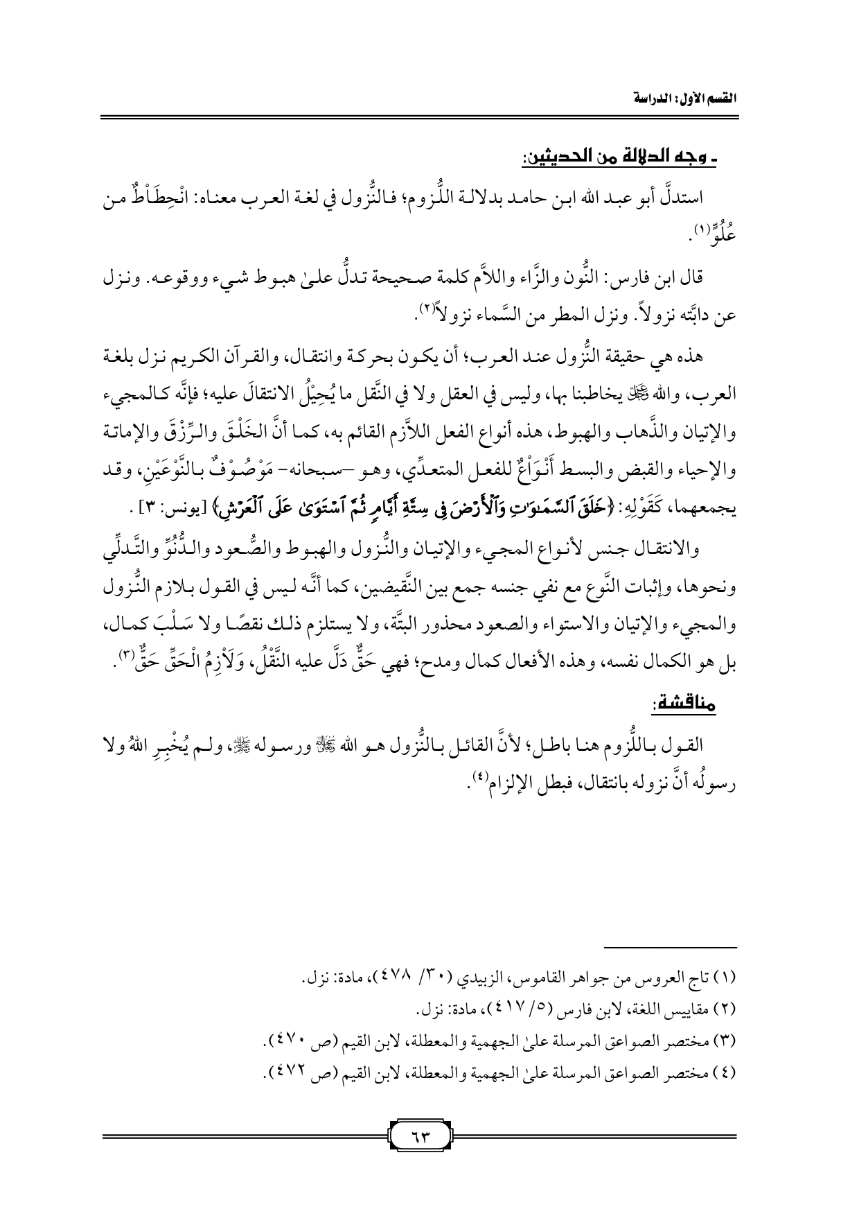 استدلَّ أبو عبد الله ابن حامد بدلالة اللُّزوم؛ فالنُّزول في لغة العرب معناه: انْحِطَاطٌ من عُلُوٍّ (¬1).
