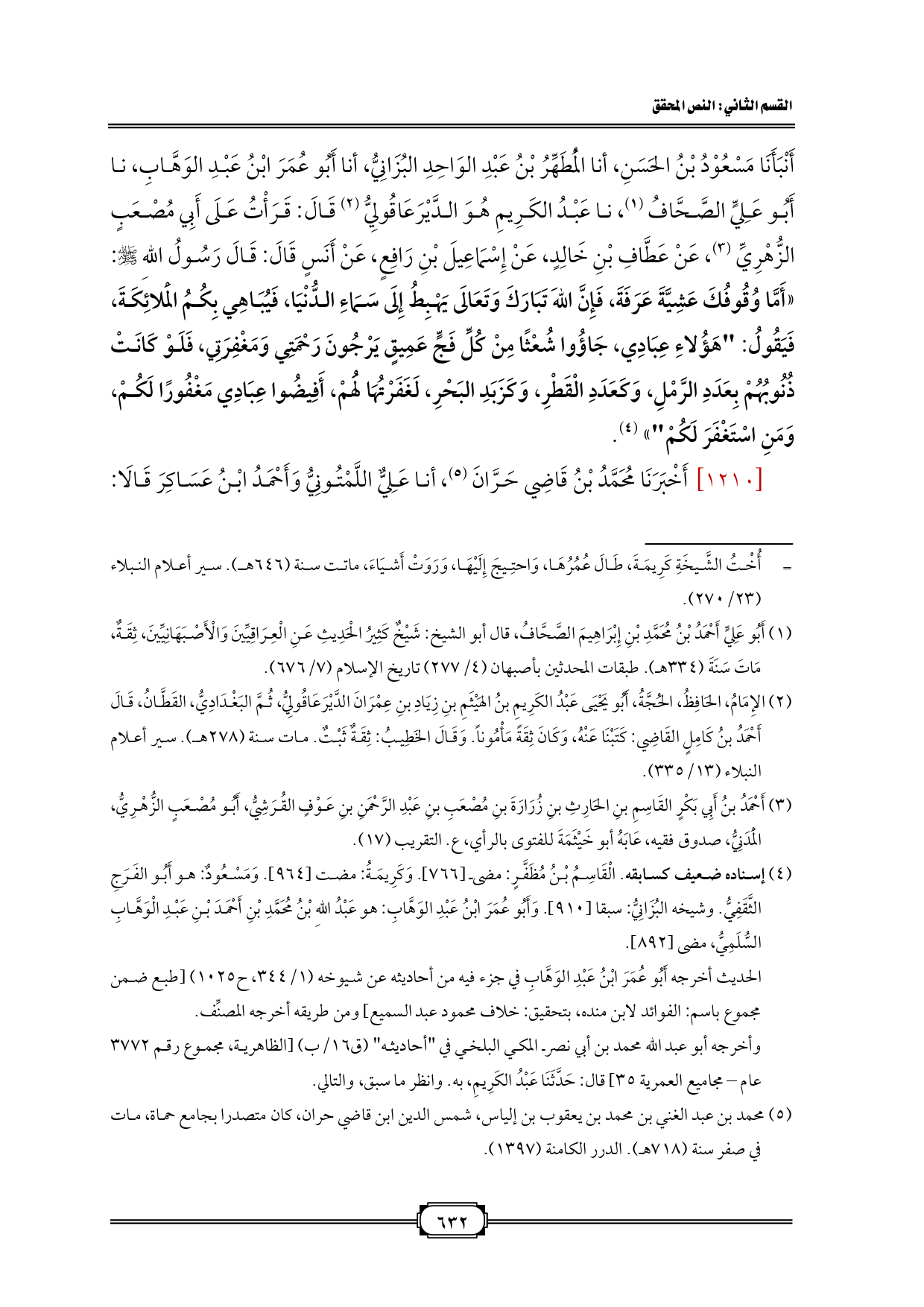 أَنْبَأَنَا مَسْعُوْدُ بْنُ الحَسَنِ، أنا الْمُطَهِّرُ بْنُ عَبْدِ الوَاحِدِ البُزَانِيُّ، أنا أَبُو عُمَرَ ابْنُ عَبْدِ الوَهَّابِ، نا أَبُو عَلِيٍّ الصَّحَّافُ (¬1)، نا عَبْدُ الكَرِيمِ هُوَ الدَّيْرَعَاقُولِيُّ (¬2) قَالَ: قَرَأْتُ عَلَى أَبِي مُصْعَبٍ الزُّهْرِيِّ (¬3)، عَنْ عَطَّافِ بْنِ خَالِدٍ، عَنْ إِسْمَاعِيلَ بْنِ رَافِعٍ، عَنْ أَنَسٍ قَالَ: قَالَ رَسُولُ اللهِ - صلى الله عليه وسلم -: «أَمَّا وُقُوفُكَ عَشِيَّةَ عَرَفَةَ، فَإِنَّ اللهَ تَبَارَكَ وَتَعَالَى يَهْبِطُ إِلَى سَمَاءِ الدُّنْيَا، فَيُبَاهِي بِكُمُ الْمَلائِكَةَ، فَيَقُولُ: "هَؤُلاءِ عِبَادِي، جَاؤُوا شُعْثًا مِنْ كُلِّ فَجٍّ عَمِيقٍ يَرْجُونَ رَحْمَتِي وَمَغْفِرَتِي، فَلَوْ كَانَتْ ذُنُوبُهُمْ بِعَدَدِ الرَّمْلِ، وَكَعَدَدِ الْقَطْرِ، وَكَزَبَدِ البَحْرِ، لَغَفَرْتُهَا لَهُمْ، أَفِيضُوا عِبَادِي مَغْفُورًا لَكُمْ، وَمَنِ اسْتَغْفَرَ لَكُمْ"» (¬4).