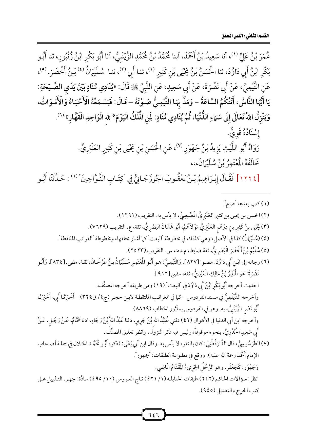 عُمَرَ بْنُ عَلِيٍّ (¬1)، أنا سَعِيدُ بْنُ أَحْمَدَ، أبنا مُحَمَّدُ بْنُ مُحَمَّدِ الزَّيْنَبِيُّ، أنا أَبُو بَكْرِ ابْنُ زُنْبُورٍ، ثنا أَبُو بَكْرِ ابْنُ أَبِي دَاوُدَ، ثنا الْحَسَنُ بْنُ يَحْيَى بْنِ كَثِيرٍ (¬2)، ثنا أَبِي (¬3)، ثنا سُلَيْمَانُ (¬4) بْنُ أَخْضَرَ (¬5)، عَنِ التَّيْمِيِّ، عَنْ أَبِي نَضْرَةَ، عَنْ أَبِي سَعِيدٍ، عَنِ النَّبِيِّ - صلى الله عليه وسلم - قَالَ: «يُنَادِي مُنَادٍ بَيْنَ يَدَيِ الصَّيْحَةِ: يَا أَيُّهَا النَّاسُ، أَتَتْكُمُ السَّاعَةُ - وَمَدَّ بِهَا التَّيْمِيُّ صَوْتَهُ - قَالَ: فَيَسْمَعُهُ الْأَحْيَاءُ وَالْأَمْوَاتُ، وَيَنْزِلُ اللهُ تَعَالَى إِلَى سَمَاءِ الدُّنْيَا، ثُمَّ يُنَادِي مُنَادٍ: لِمَنِ الْمُلْكُ الْيَوْمَ؟ للهِ الْوَاحِدِ الْقَهَّارِ» (¬6).