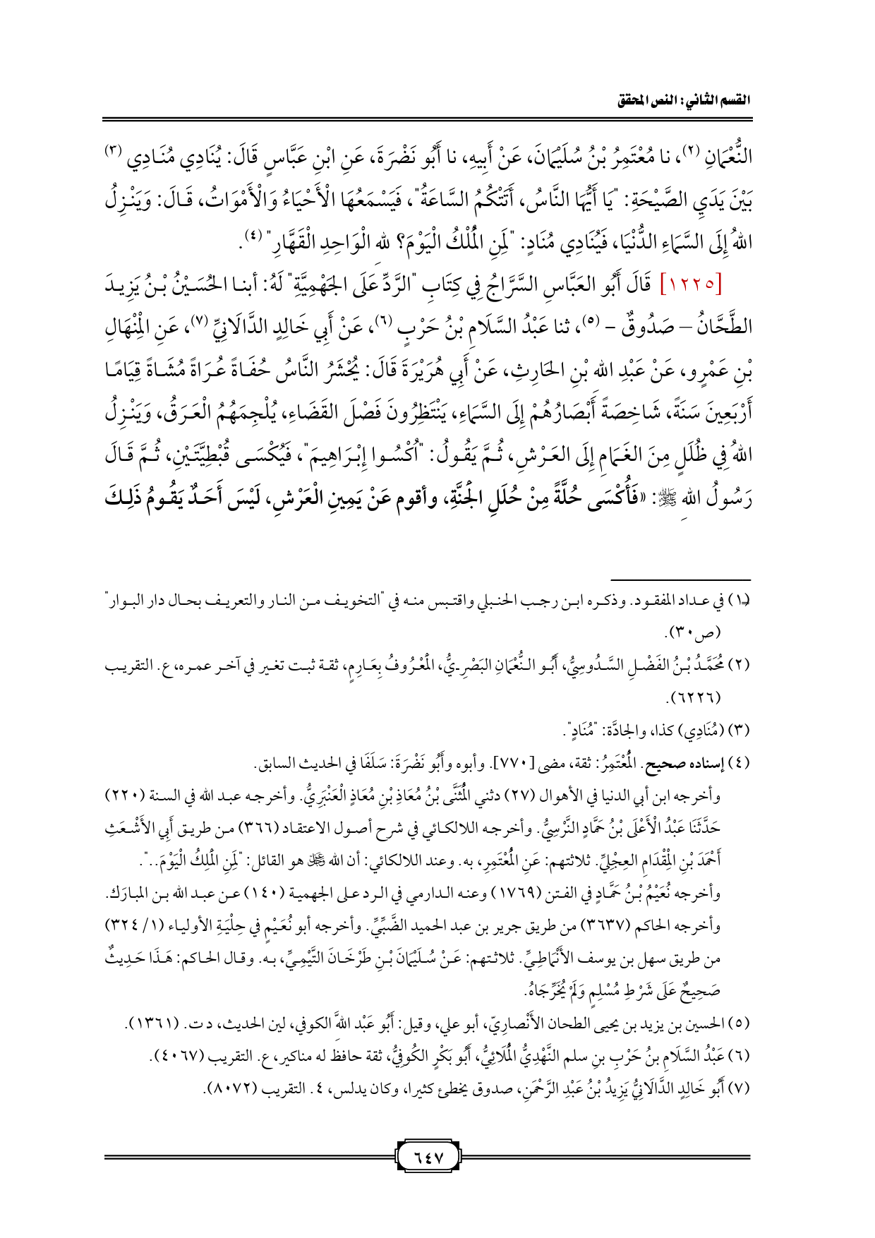 وأخرجه ابن أبي الدنيا في الأهوال (27) دثني الْمُثَنَّى بْنُ مُعَاذِ بْنِ مُعَاذٍ الْعَنْبَرِيُّ. وأخرجه عبد الله في السنة (220) حَدَّثَنَا عَبْدُ الْأَعْلَى بْنُ حَمَّادٍ النَّرْسِيُّ. وأخرجه اللالكائي في شرح أصول الاعتقاد (366) من طريق أَبِي الأَشْعَثِ أَحْمَدَ بْنِ الْمِقْدَامِ العِجْلِيِّ. ثلاثتهم: عَنِ الْمُعْتَمِرِ، به. وعند اللالكائي: أن الله - عز وجل - هو القائل: "لِمَنِ الْمَلِكُ الْيَوْمَ .. ".
