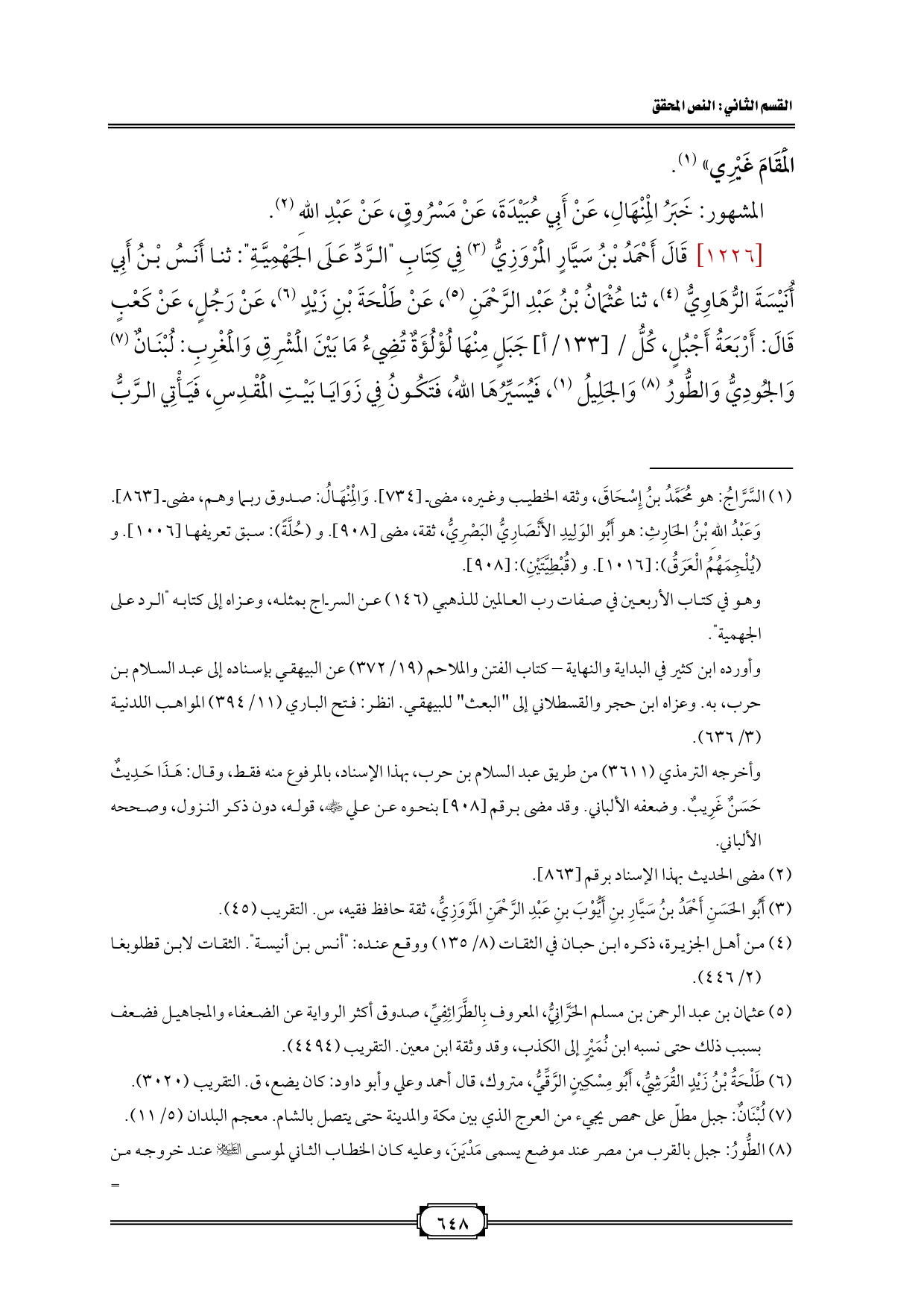 [1226] قَالَ أَحْمَدُ بْنُ سَيَّارٍ الْمَرْوَزِيُّ (¬3) فِي كِتَابِ "الرَّدِّ عَلَى الجَهْمِيَّةِ": ثنا أَنَسُ بْنُ أَبِي أُنَيْسَةَ الرُّهَاوِيُّ (¬4)، ثنا عُثْمَانُ بْنُ عَبْدِ الرَّحْمَنِ (¬5)، عَنْ طَلْحَةَ بْنِ زَيْدٍ (¬6)، عَنْ رَجُلٍ، عَنْ كَعْبٍ قَالَ: أَرْبَعَةُ أَجْبُلٍ، كُلُّ / [133/أ] جَبَلٍ مِنْهَا لُؤْلُؤَةٌ تُضِيءُ مَا بَيْنَ الْمَشْرِقِ وَالْمَغْرِبِ: لُبْنَانٌ (¬7) وَالجُودِيُّ وَالطُّورُ (¬8) وَالجَلِيلُ (¬9)، فَيُسَيِّرُهَا اللهُ، فَتَكُونُ فِي زَوَايَا بَيْتِ الْمَقْدِسِ، فَيَأْتِي الرَّبُّ