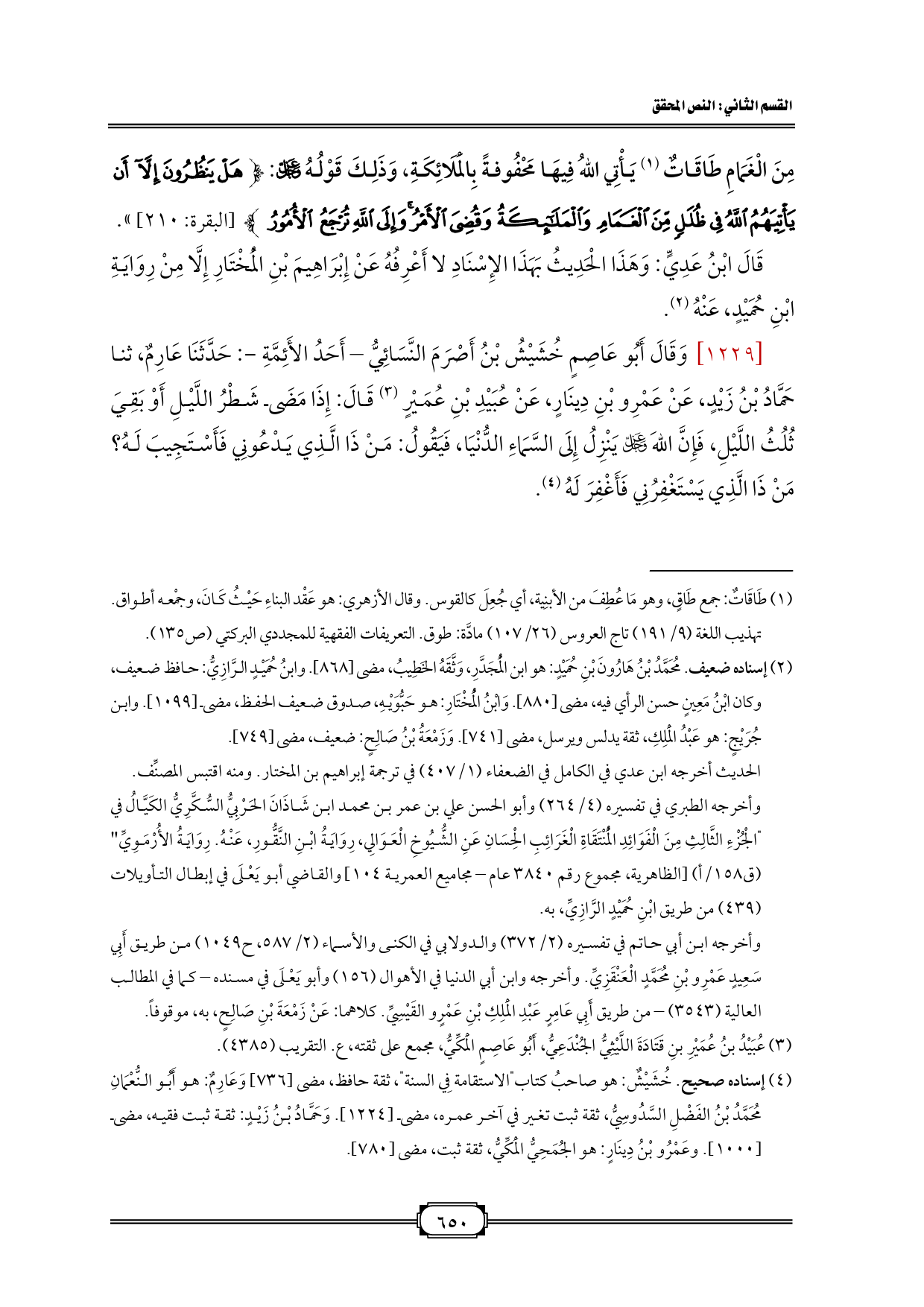 [1229] وَقَالَ أَبُو عَاصِمٍ خُشَيْشُ بْنُ أَصْرَمَ النَّسَائِيُّ - أَحَدُ الأَئِمَّةِ -: حَدَّثَنَا عَارِمٌ، ثنا حَمَّادُ بْنُ زَيْدٍ، عَنْ عَمْرِو بْنِ دِينَارٍ، عَنْ عُبَيْدِ بْنِ عُمَيْرٍ (¬3) قَالَ: إِذَا مَضَى شَطْرُ اللَّيْلِ أَوْ بَقِيَ ثُلُثُ اللَّيْلِ، فَإِنَّ اللهَ - عز وجل - يَنْزِلُ إِلَى السَّمَاءِ الدُّنْيَا، فَيَقُولُ: مَنْ ذَا الَّذِي يَدْعُونِي فَأَسْتَجِيبَ لَهُ؟ مَنْ ذَا الَّذِي يَسْتَغْفِرُنِي فَأَغْفِرَ لَهُ (¬4).