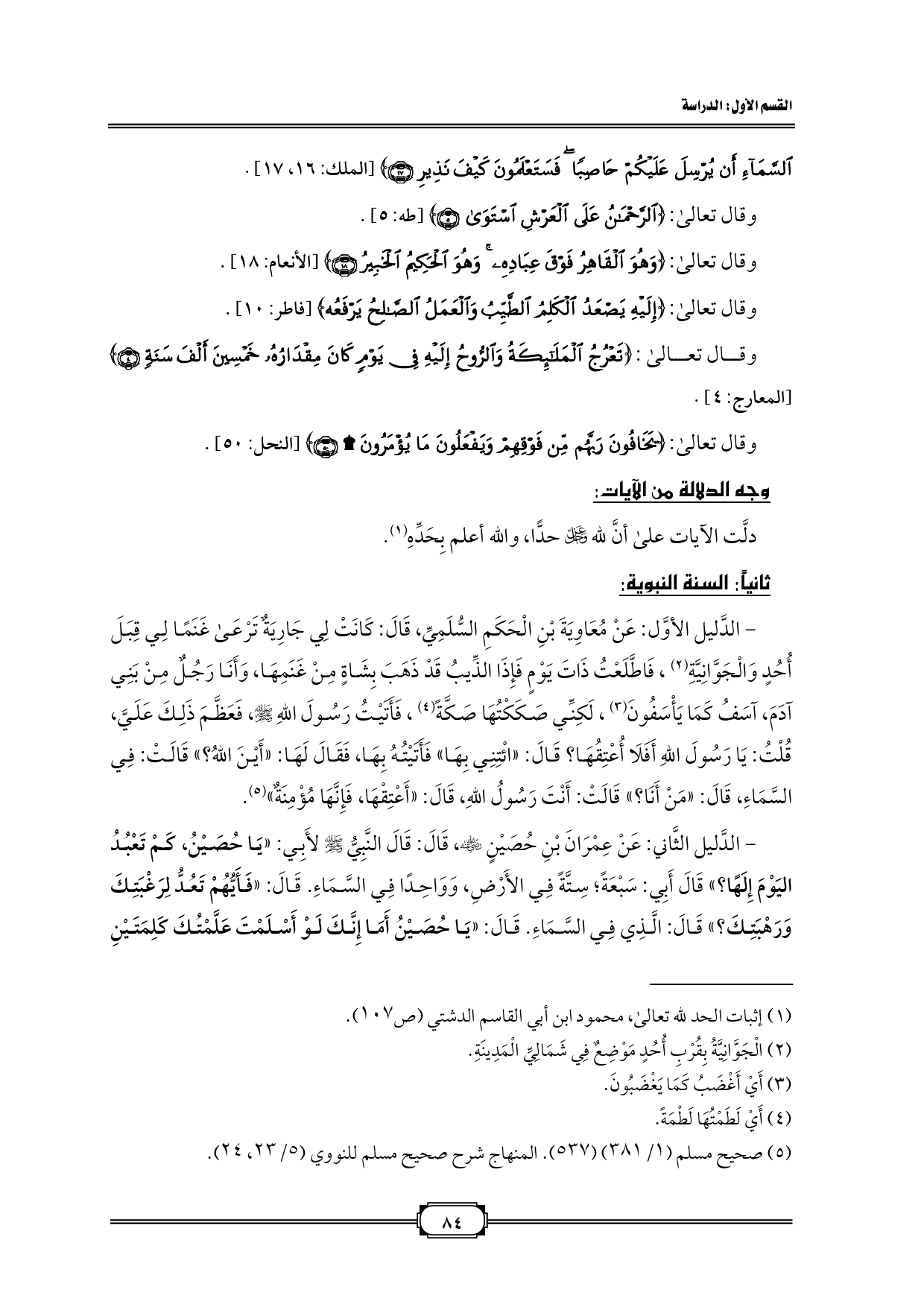 - الدَّليل الأوَّل: عَنْ مُعَاوِيَةَ بْنِ الْحَكَمِ السُّلَمِيِّ، قَالَ: كَانَتْ لِي جَارِيَةٌ تَرْعَى غَنَمًا لِي قِبَلَ أُحُدٍ وَالْجَوَّانِيَّةِ (¬2)، فَاطَّلَعْتُ ذَاتَ يَوْمٍ فَإِذَا الذِّيبُ قَدْ ذَهَبَ بِشَاةٍ مِنْ غَنَمِهَا، وَأَنَا رَجُلٌ مِنْ بَنِي آدَمَ، آسَفُ كَمَا يَأْسَفُونَ (¬3)، لَكِنِّي صَكَكْتُهَا صَكَّةً (¬4)، فَأَتَيْتُ رَسُولَ اللهِ - صلى الله عليه وسلم -، فَعَظَّمَ ذَلِكَ عَلَيَّ، قُلْتُ: يَا رَسُولَ اللهِ أَفَلَا أُعْتِقُهَا؟ قَالَ: «ائْتِنِي بِهَا» فَأَتَيْتُهُ بِهَا، فَقَالَ لَهَا: «أَيْنَ اللهُ؟ » قَالَتْ: فِي السَّمَاءِ، قَالَ: «مَنْ أَنَا؟ » قَالَتْ: أَنْتَ رَسُولُ اللهِ، قَالَ: «أَعْتِقْهَا، فَإِنَّهَا مُؤْمِنَةٌ» (¬5).