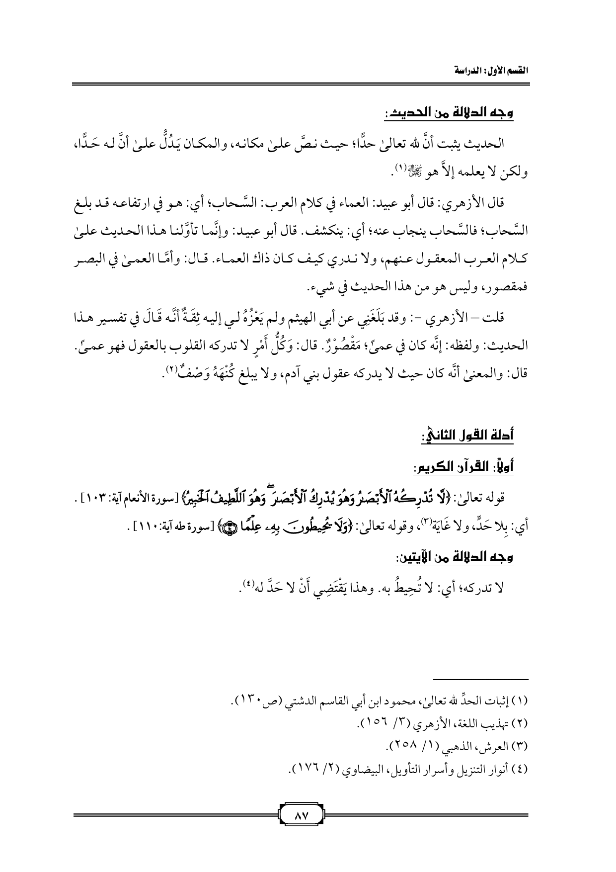 قوله تعالى: {لَا تُدْرِكُهُ الْأَبْصَارُ وَهُوَ يُدْرِكُ الْأَبْصَارَ وَهُوَ اللَّطِيفُ الْخَبِيرُ} [سورة الأنعام آية: 103]. أي: بِلا حَدٍّ، ولا غَايَة (¬3)، وقوله تعالى: {وَلَا يُحِيطُونَ بِهِ عِلْمًا} [سورة طه آية: 110].