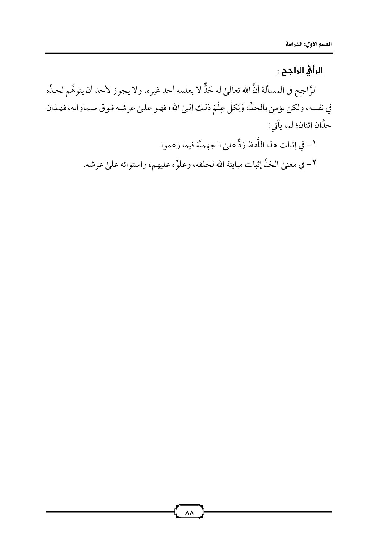 الرَّاجح في المسألة أنَّ الله تعالى له حَدٌّ لا يعلمه أحد غيره، ولا يجوز لأحد أن يتوهَّم لحدِّه في نفسه، ولكن يؤمن بالحدِّ، وَيَكِلُ عِلْمَ ذلك إلى الله؛ فهو على عرشه فوق سماواته، فهذان حدَّان اثنان؛ لما يأتي: