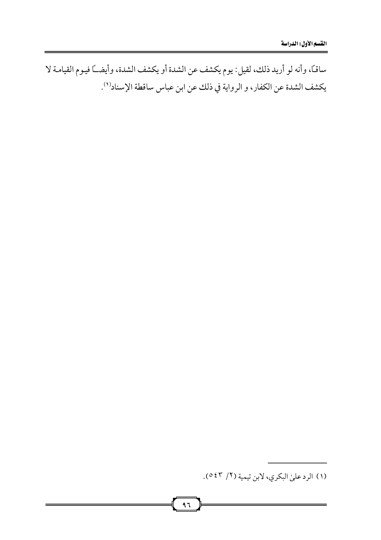 ساقاً، وأنه لو أريد ذلك، لقيل: يوم يكشف عن الشدة أو يكشف الشدة، وأيضاً فيوم القيامة لا يكشف الشدة عن الكفار، والرواية في ذلك عن ابن عباس ساقطة الإسناد (¬1).