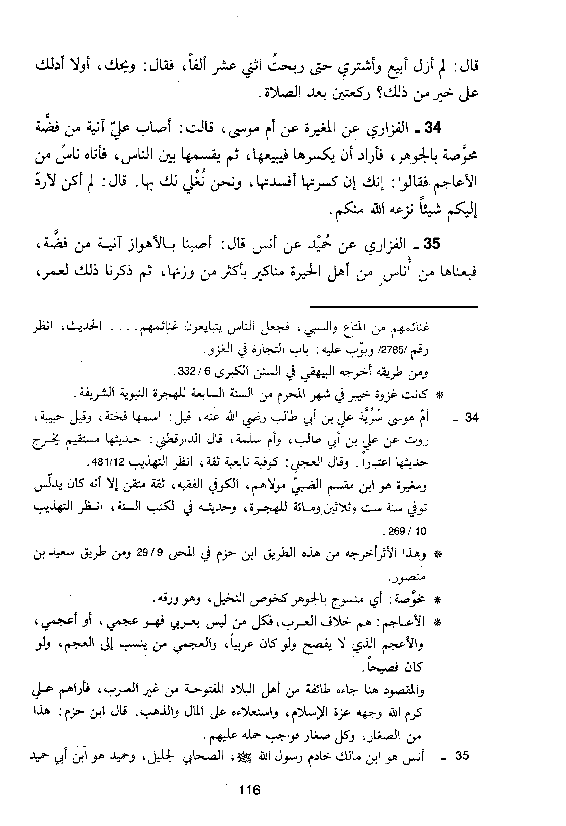 34 - الْفَزَارِيُّ، عَنِ الْمُغِيرَةِ، عَنْ أُمِّ مُوسَى، قَالَتْ: أَصَابَ عَلِيٌّ آنِيَةً مِنْ فِضَّةٍ مُحَوَّصَةٍ بِالْجَوْهَرِ، فَأَرَادَ أَنْ يَكْسِرَهَا فَيَبِيعَهَا، ثُمَّ يَقْسِمَهَا بَيْنَ النَّاسِ، فَأَتَاهُ نَاسٌ مِنَ الْأَعَاجِمِ فَقَالُوا: إِنَّكَ إِنْ كَسَرْتَهَا أَفْسَدْتَهَا، وَنَحْنُ نُغْلِي لَكَ بِهَا. قَالَ: §لَمْ أَكُنْ لِأَرُدَّ إِلَيْكُمْ شَيْئًا نَزَعَهُ اللَّهُ مِنْكُمْ
