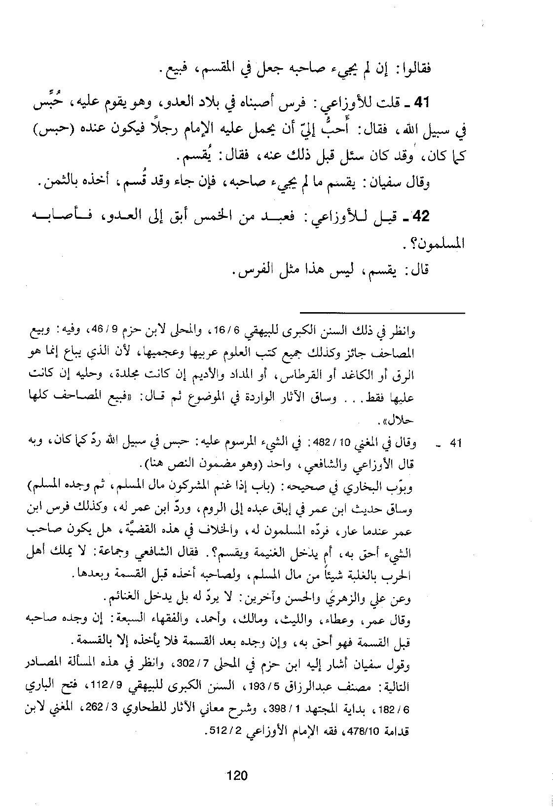 41 - قُلْتُ لِلْأَوْزَاعِيِّ: فَرَسٌ أَصَبْنَاهُ فِي بِلَادِ الْعَدُوِّ، وَهُوَ يَقُومُ عَلَيْهِ حُبِسَ فِي سَبِيلِ اللَّهِ؟ فَقَالَ: أَحَبُّ إِلَيَّ أَنْ يَحْمِلَ عَلَيْهِ الْإِمَامُ رَجُلًا فَيَكُونَ عِنْدَهُ حَبْسٌ كَمَا كَانَ. وَقَدْ كَانَ سُئِلَ قَبْلَ ذَلِكَ عَنْهُ، فَقَالَ: يُقْسَمُ. وَقَالَ سُفْيَانُ: يُقْسَمُ مَا لَمْ يَجِئْ صَاحِبُهُ، فَإِنْ جَاءَ وَقَدْ قُسِمَ، أَخَذَهُ بِالثَّمَنِ