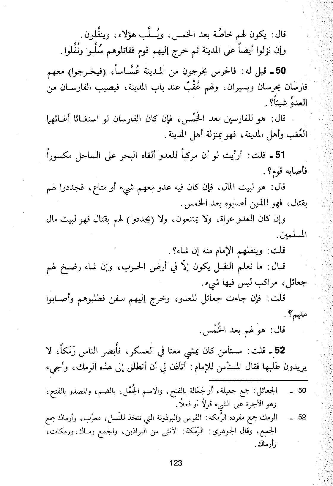 50 - قِيلَ لَهُ: فَالْحَرَسُ يَخْرُجُونَ مِنَ الْمَدِينَةِ عُسَّاسًا، فَيُخْرِجُونَ مَعَهُمْ فَارِسَانِ يَحْرُسَانِ وَيَسِيرَانِ، وَلَهُمْ عُقْبٌ عِنْدَ بَابِ الْمَدِينَةِ، فَيُصِيبُ الْفَارِسَانِ مِنَ الْعَدُوِّ شَيْئًا؟ قَالَ: هُوَ لِلْفَارِسَيْنِ بَعْدَ الْخُمُسِ، فَإِنْ كَانَ الْفَارِسَانِ لَوِ اسْتَغَاثَا أَغَاثَهُمَا الْعُقْبُ وَأَهْلُ الْمَدِينَةِ، فَهُوَ بِمَنْزِلَةِ أَهْلِ الْمَدِينَةِ.