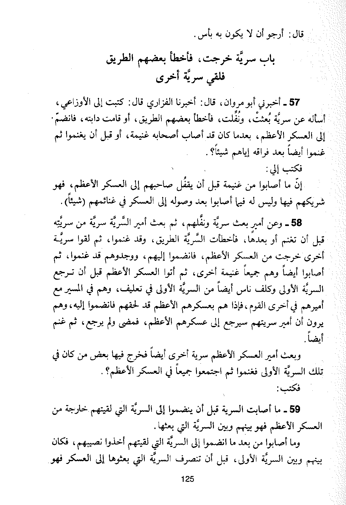59 - مَا أَصَابَتِ السَّرِيَّةُ قَبْلَ أَنْ يَنْضَمُّوا إِلَى السَّرِيَّةِ الَّتِي لَقِيَتْهُمْ خَارِجَةً مِنَ الْعَسْكَرِ الْأَعْظَمِ فَهُوَ بَيْنَهُمْ وَبَيْنَ السَّرِيَّةِ الَّتِي بَعَثَهَا. وَمَا أَصَابُوا مِنْ بَعْدِ مَا انْضَمُّوا إِلَى السَّرِيَّةِ الَّتِي لَقِيَتْهُمْ أَخَذُوا نَصِيبَهُمْ، فَكَانَ بَيْنَهُمْ وَبَيْنَ السَّرِيَّةِ الْأُولَى، قَبْلَ أَنْ تَنْصَرِفَ السَّرِيَّةُ الَّتِي بَعَثُوهَا إِلَى الْعَسْكَرِ فَهُوَ