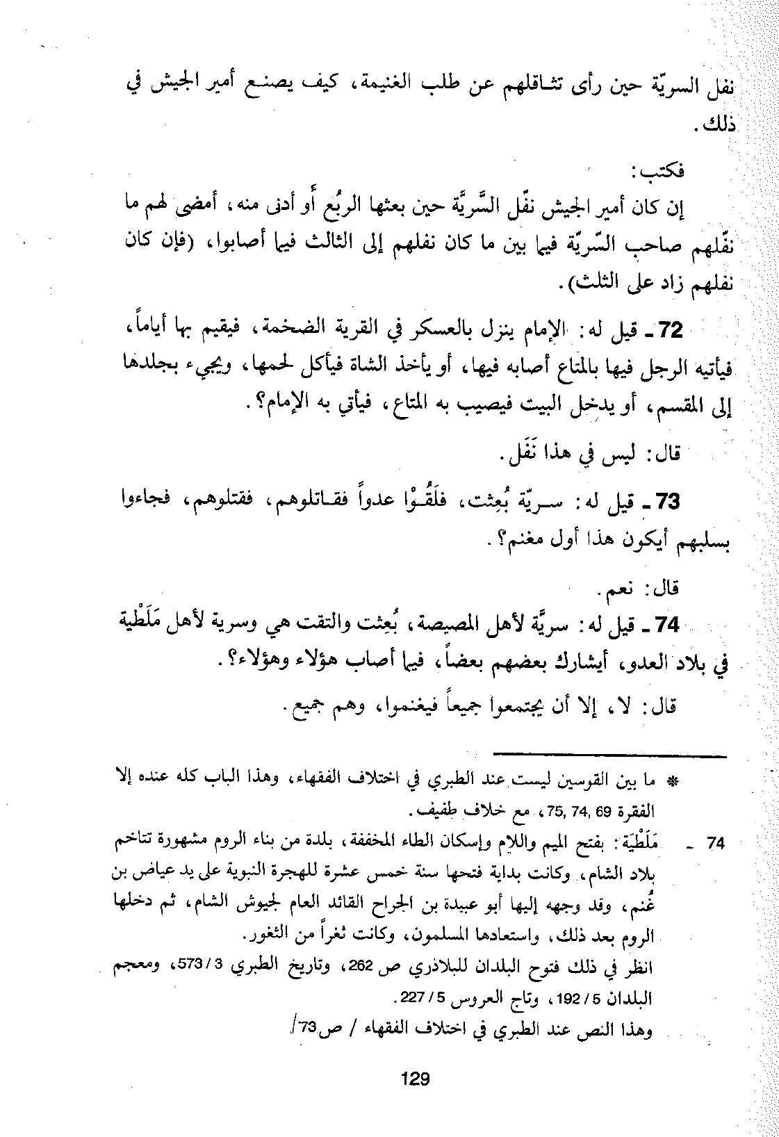 74 - قِيلَ لَهُ: سَرِيَّةٌ لِأَهْلِ الْمِصِّيصَةِ بُعِثَتْ وَالْتَقَتْ هِيَ وَسَرِيَّةٌ لِأَهْلِ مَلَطِيَةَ فِي بِلَادِ الْعَدُوِّ، أَيُشَارِكُ بَعْضُهُمْ بَعْضًا، فِيمَا أَصَابَ هَؤُلَاءِ وَهَؤُلَاءِ؟ قَالَ: لَا، إِلَّا أَنْ يَجْتَمِعُوا جَمِيعًا فَيَغْنَمُوا، وَهُمْ جَمِيعٌ.