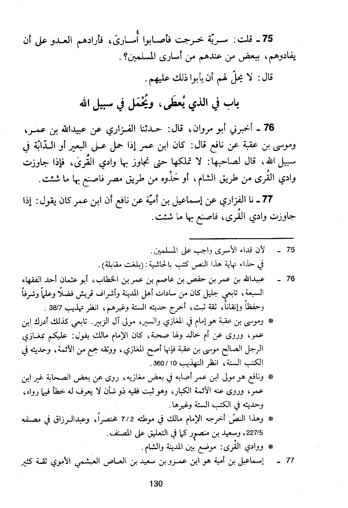 76 - أَخْبَرَنِي أَبُو مَرْوَانَ قَالَ: حَدَّثَنَا الْفَزَارِيُّ، عَنْ عُبَيْدِ اللَّهِ بْنِ عُمَرَ، وَمُوسَى بْنِ عُقْبَةَ، عَنْ نَافِعٍ، قَالَ: كَانَ ابْنُ عُمَرَ إِذَا حَمَلَ عَلَى الْبَعِيرِ أَوِ الدَّابَّةِ فِي سَبِيلِ اللَّهِ، قَالَ لِصَاحِبِهَا: «§لَا تَمْلُكْهَا حَتَّى تُجَاوِزَ بِهَا وَادِي الْقُرَى، فَإِذَا جَاوَزْتَ وَادِي الْقُرَى مِنْ طَرِيقِ الشَّامِ، أَوْ حَذْوَهُ مِنْ طَرِيقِ مِصْرَ فَاصْنَعْ بِهَا مَا شِئْتَ»