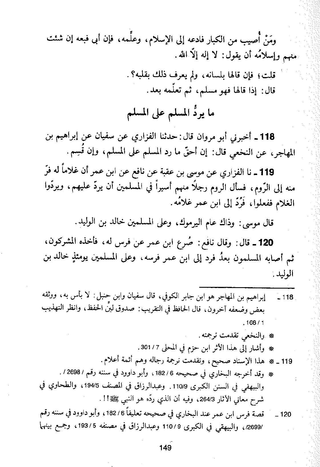 119 - نا الْفَزَارِيُّ، عَنْ مُوسَى بْنِ عُقْبَةَ، عَنْ نَافِعٍ، عَنِ ابْنِ عُمَرَ: §أَنَّ غُلَامًا لَهُ فَرَّ مِنْهُ إِلَى الرُّومِ، فَسَأَلَ الرُّومُ رَجُلًا مِنْهُمْ أَسِيرًا فِي الْمُسْلِمِينَ أَنْ يُرَدَّ عَلَيْهِمْ، وَيَرُدُّوا الْغُلَامَ فَفَعَلُوا، فَرُدَّ إِلَى ابْنِ عُمَرَ غُلَامُهُ، قَالَ مُوسَى: وَذَاكَ عَامَ الْيَرْمُوكِ، وَعَلَى الْمُسْلِمِينَ خَالِدُ بْنُ الْوَلِيدِ