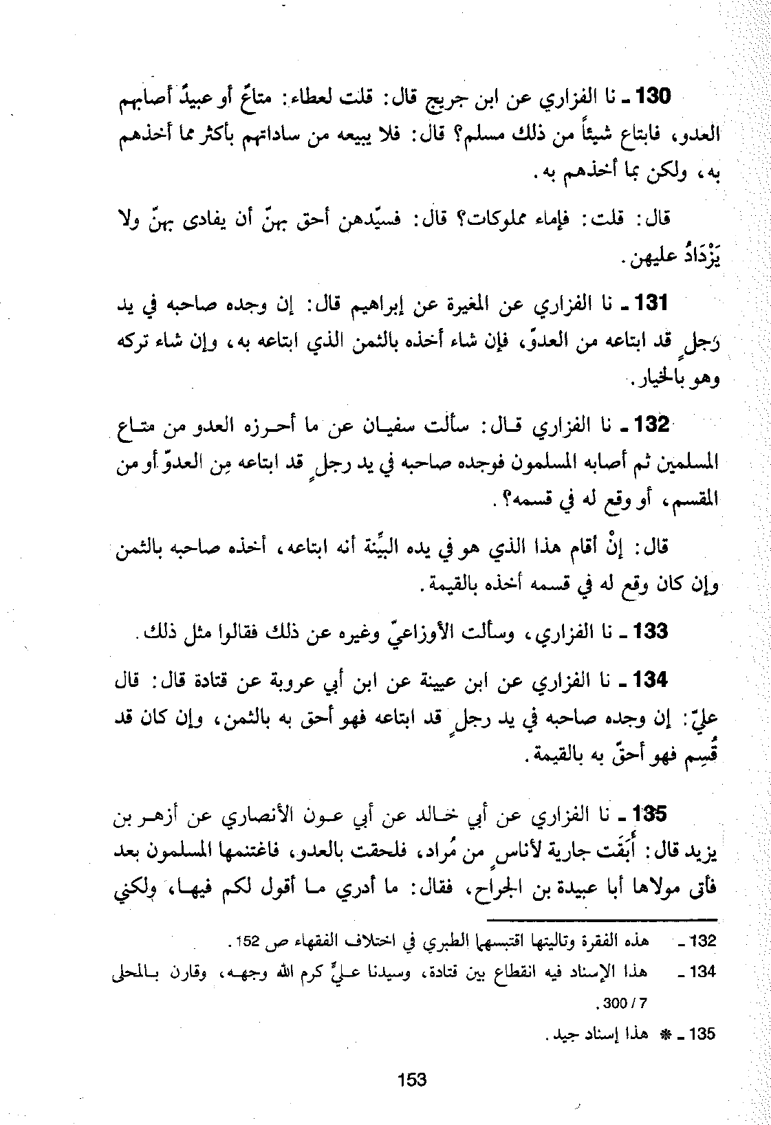 130 - نا الْفَزَارِيُّ، عَنِ ابْنِ جُرَيْجٍ، قَالَ: " قُلْتُ لِعَطَاءٍ: §مَتَاعٌ أَوْ عَبِيدٌ أَصَابَهُمُ الْعَدُوُّ، فَابْتَاعَ شَيْئًا مِنْ ذَلِكَ مُسْلِمٌ؟ قَالَ: فَلَا يَبِعْهُ مِنْ سَادَاتِهِمْ بِأَكْثَرَ مِمَّا أَخَذَهُمْ بِهِ، وَلَكِنْ بِمَا أَخَذَهُمْ بِهِ. قَالَ: قُلْتُ: فَإِمَاءٌ مَمْلُوكَاتٌ؟ قَالَ: فَسَيِّدُهُنَّ أَحَقُّ بِهِنَّ أَنْ يُفَادَى بِهِنَّ وَلَا يَزْدَادُ عَلَيْهِنَّ