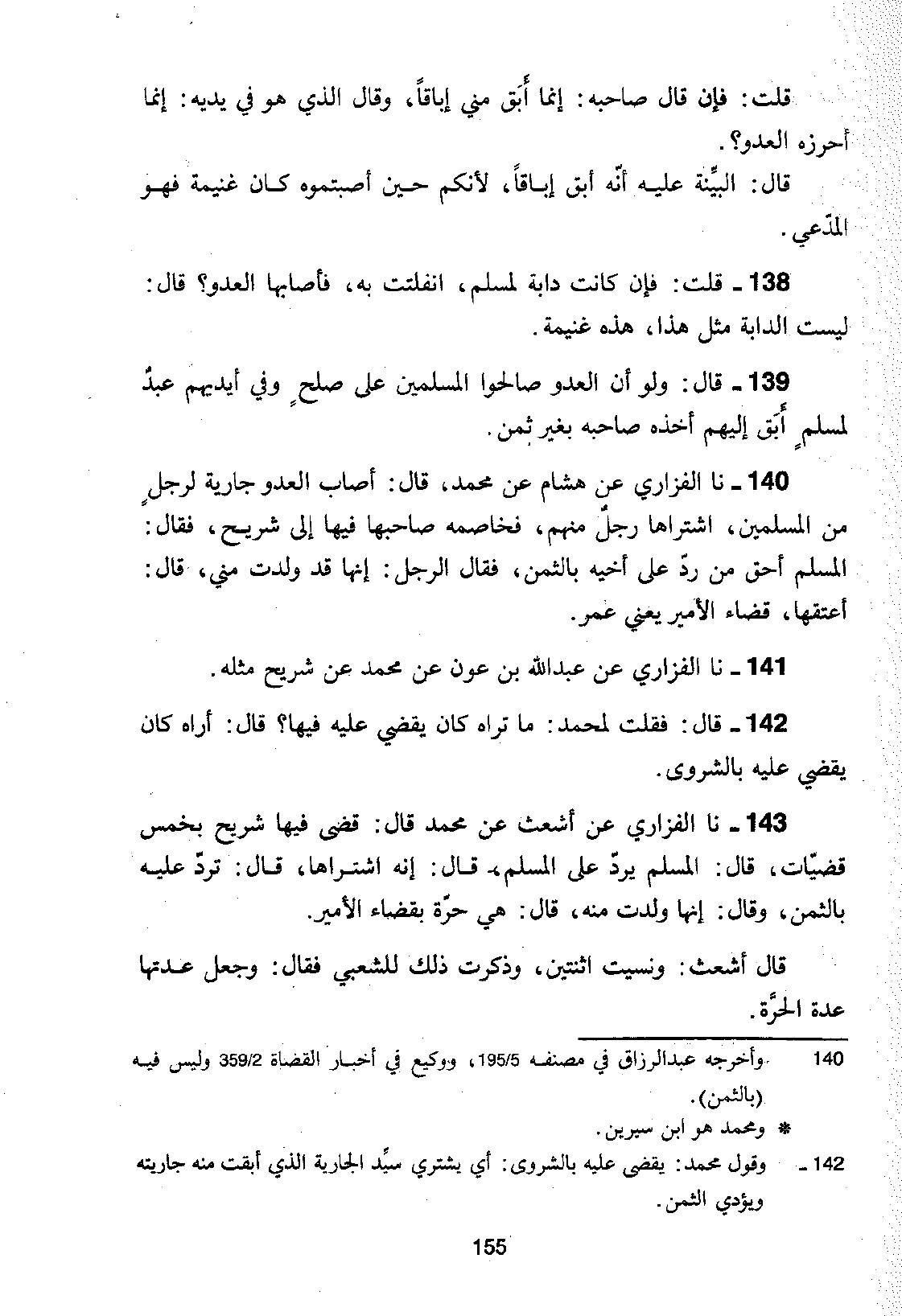140 - نا الْفَزَارِيُّ، عَنْ هِشَامٍ، عَنْ مُحَمَّدٍ، قَالَ: " §أَصَابَ الْعَدُوُّ جَارِيَةً لِرَجُلٍ مِنَ الْمُسْلِمِينَ، اشْتَرَاهَا رَجُلٌ مِنْهُمْ، فَخَاصَمَهُ صَاحِبُهَا فِيهَا إِلَى شُرَيْحٍ، فَقَالَ: الْمُسْلِمُ أَحَقُّ مَنْ رَدَّ عَلَى أَخِيهِ بِالثَّمَنِ، فَقَالَ الرَّجُلُ: إِنَّهَا قَدْ وَلَدَتْ مِنِّي، قَالَ: أَعْتِقْهَا، قَضَاءَ الْأَمِيرِ يَعْنِي عُمَرَ