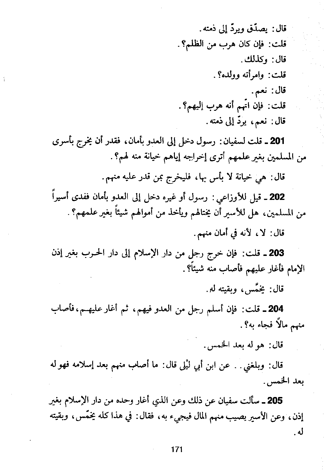 205 - سَأَلْتُ سُفْيَانَ عَنْ ذَلِكَ وَعَنِ الَّذِي أَغَارَ وَحْدَهُ مِنْ دَارِ الْإِسْلَامِ بِغَيْرِ إِذْنٍ، وَعَنِ الْأَسِيرِ يُصِيبُ مِنْهُمُ الْمَالَ فَيَجِيءُ بِهِ، فَقَالَ: فِي هَذَا كُلِّهِ يُخَمَّسُ، وَبَقِيَّتُهُ لَهُ