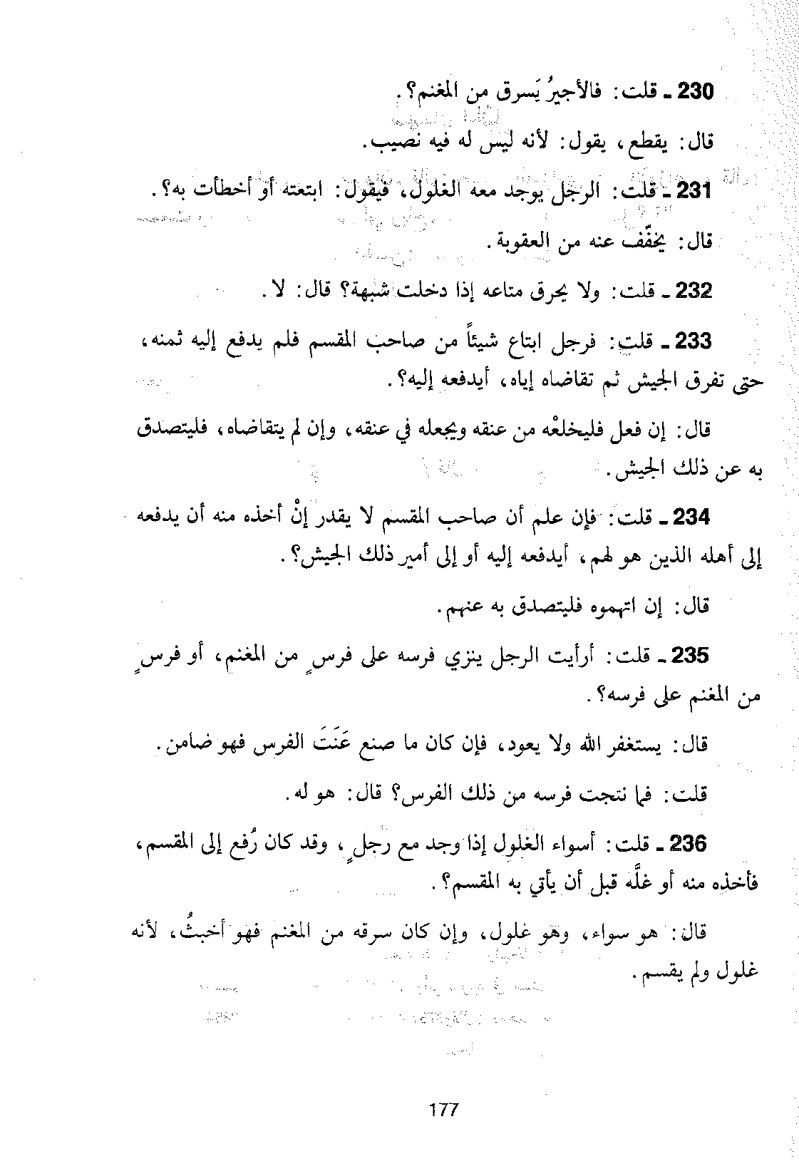 236 - قُلْتُ: أَسَوَاءٌ الْغُلُولُ إِذَا وُجِدَ مَعَ رَجُلٍ، وَقَدْ كَانَ رُفِعَ إِلَى الْمَقْسَمِ، فَأَخَذَهُ مِنْهُ أَوْ غَلَّهُ قَبْلَ أَنْ يَأْتِيَ بِهِ الْمَقْسَمَ؟ قَالَ: هُوَ سَوَاءٌ، وَهُوَ غُلُولٌ، وَإِنْ كَانَ سَرَقَهُ مِنَ الْمَغْنَمِ فَهُوَ أَخْبَثُ؛ لِأَنَّهُ غُلُولٌ وَلَمْ يُقْسَمْ