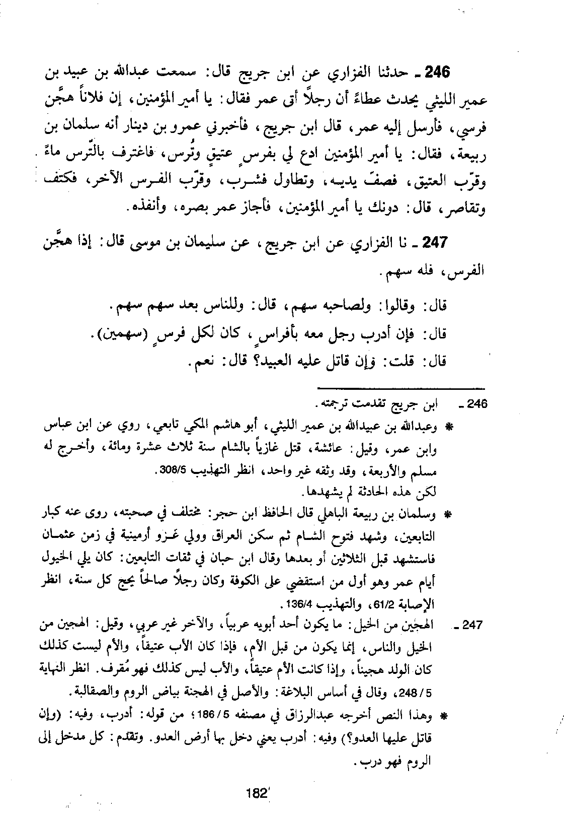 246 - حَدَّثَنَا الْفَزَارِيُّ، عَنِ ابْنِ جُرَيْجٍ، قَالَ: سَمِعْتُ عَبْدَ اللَّهِ بْنَ عُبَيْدِ بْنِ عُمَيْرٍ اللَّيْثِيَّ، يُحَدِّثُ عَطَاءً أَنَّ رَجُلًا أَتَى عُمَرَ فَقَالَ: يَا أَمِيرَ الْمُؤْمِنِينَ، §إِنَّ فُلَانًا هَجَّنَ فَرَسِي. فَأَرْسَلَ إِلَيْهِ عُمَرُ، قَالَ ابْنُ جُرَيْجٍ: فَأَخْبَرَنِي عَمْرُو بْنُ دِينَارٍ أَنَّهُ سَلْمَانُ بْنُ رَبِيعَةَ فَقَالَ: يَا أَمِيرَ الْمُؤْمِنِينَ، ادْعُ لِي بِفَرَسٍ عَتِيقٍ وَتُرْسٍ، فَاغْتَرَفَ بِالتُّرْسِ مَاءً وَقَرَّبَ الْعَتِيقَ، فَصَفَّ يَدَيْهِ، وَتَطَاوَلَ فَشَرِبَ، وَقَرَّبَ الْفَرَسَ الْآخَرَ، فَكَتِفَ وَتَقَاصَرَ، قَالَ: دُونَكَ يَا أَمِيرَ الْمُؤْمِنِينَ، فَأَجَازَ عُمَرُ بَصَرَهُ، وَأَنْفَذَهُ